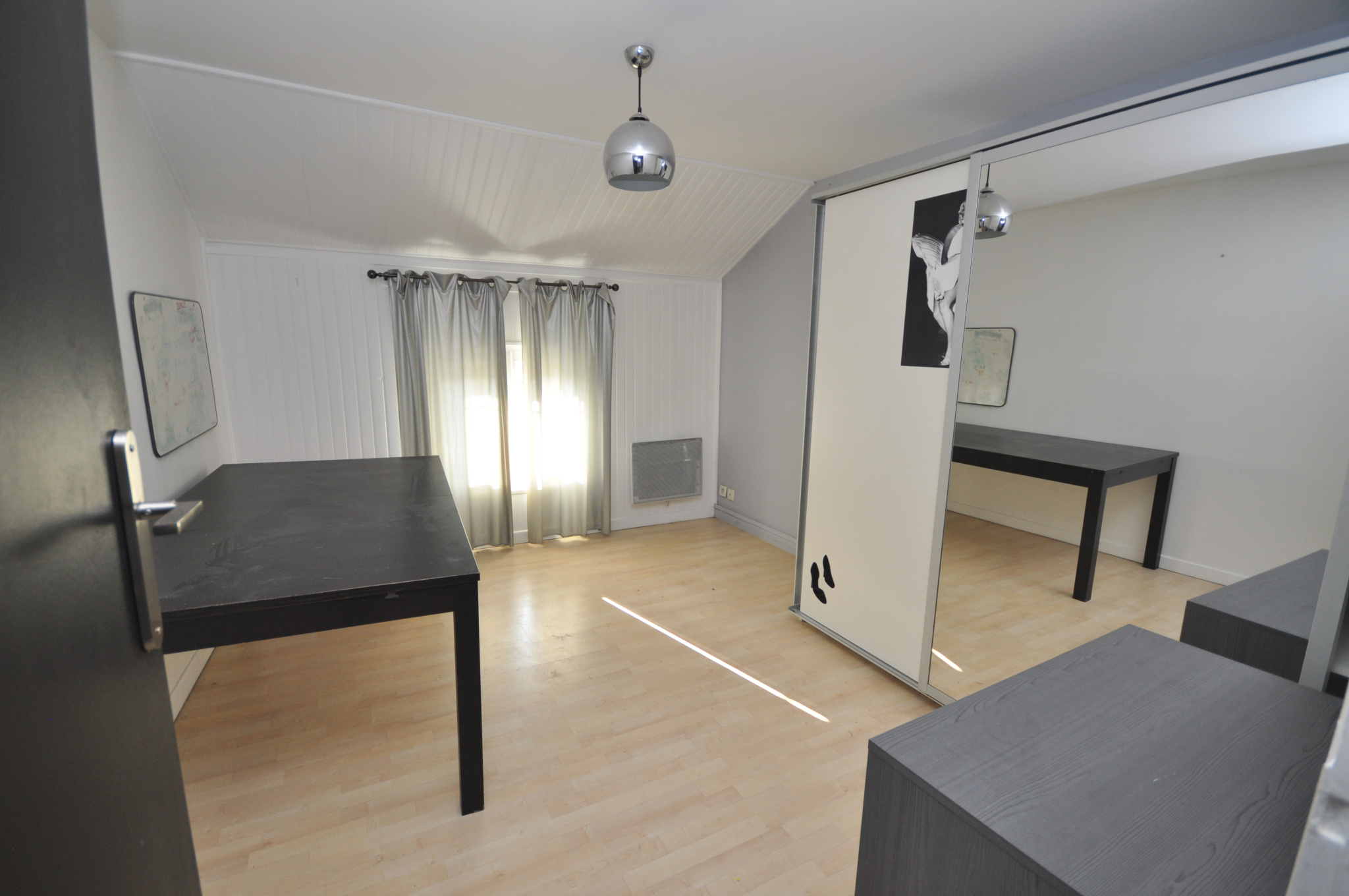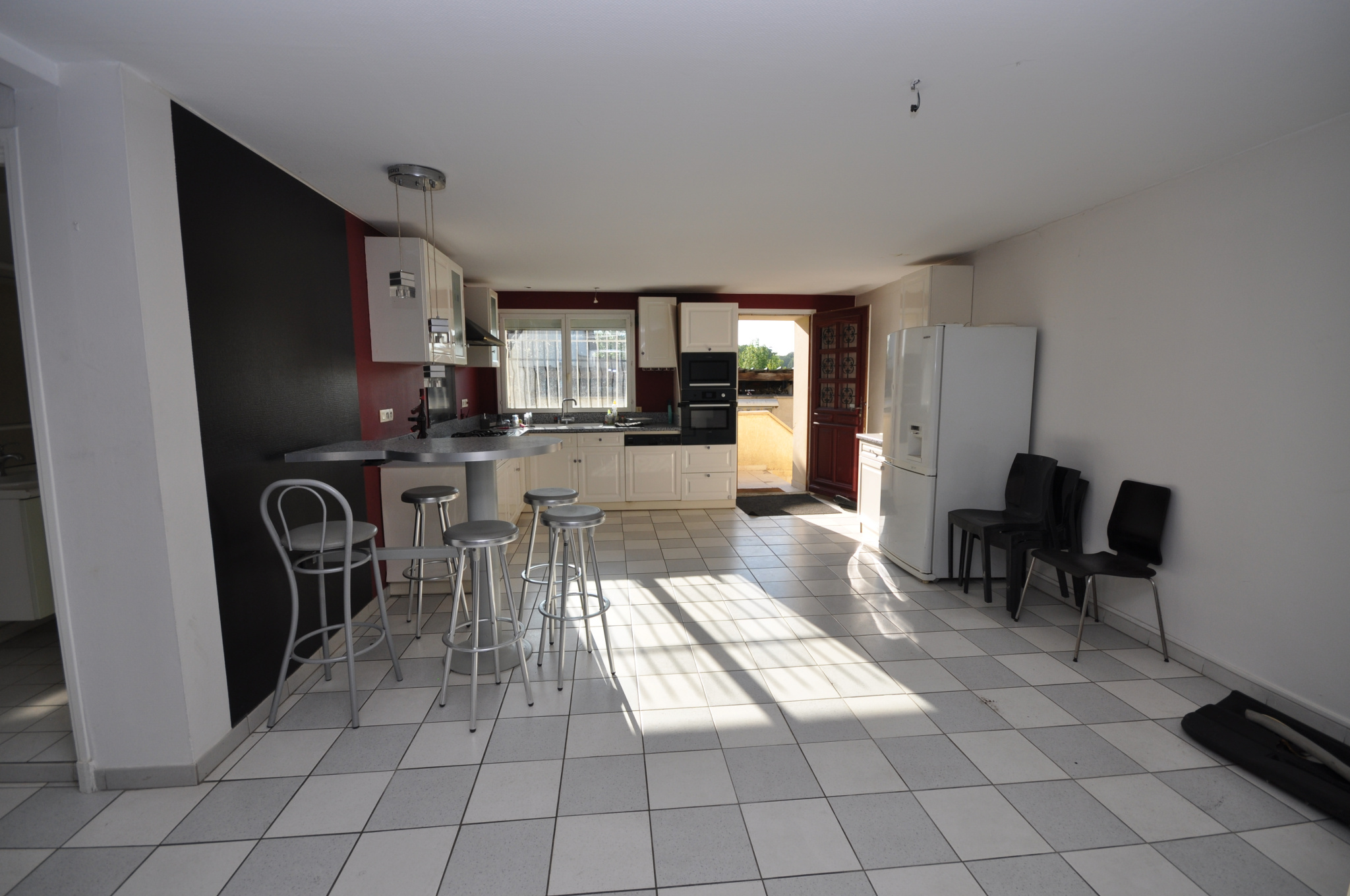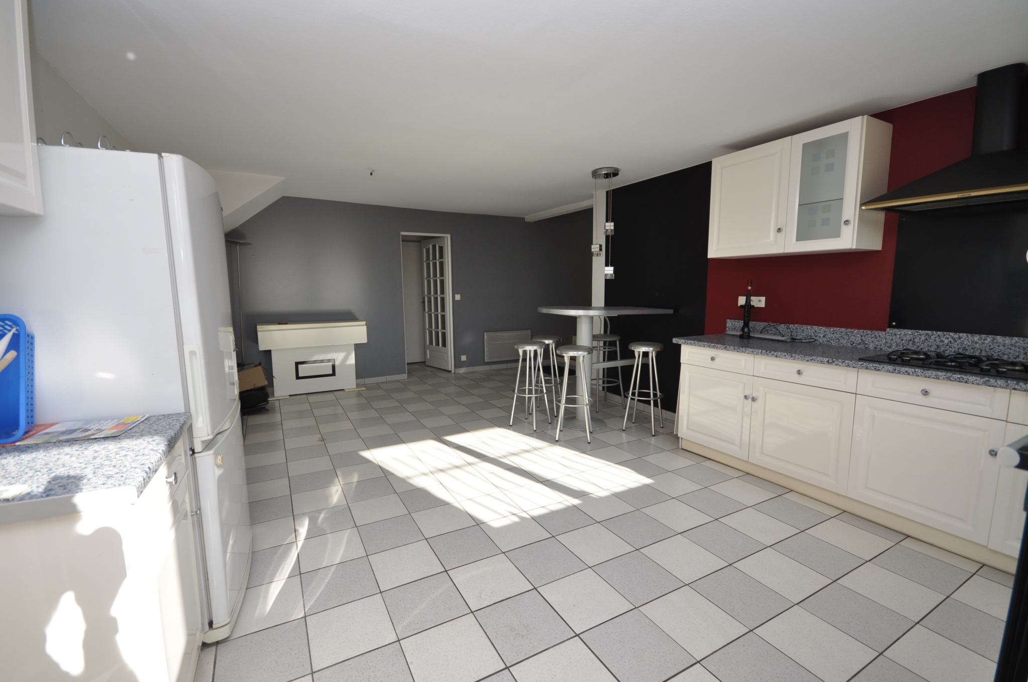 A l'étage un appartement type F5 (120 m2) qui se compose d'un cuisine aménagée avec coin repas ouvert sur la salle à manger, un salon, une salle de bains, wc, à l'étage supérieur, un palier avec penderie desservant 3 chambres, et sous combles deux greniers (80 m2 env.).