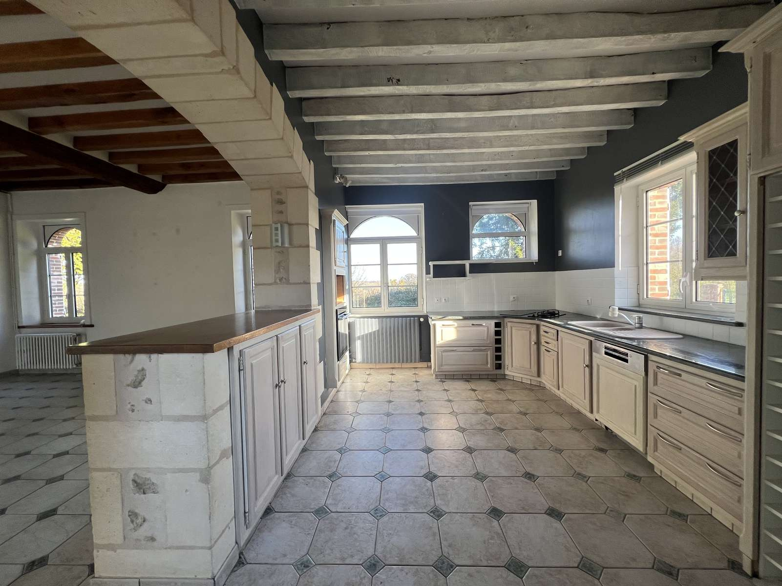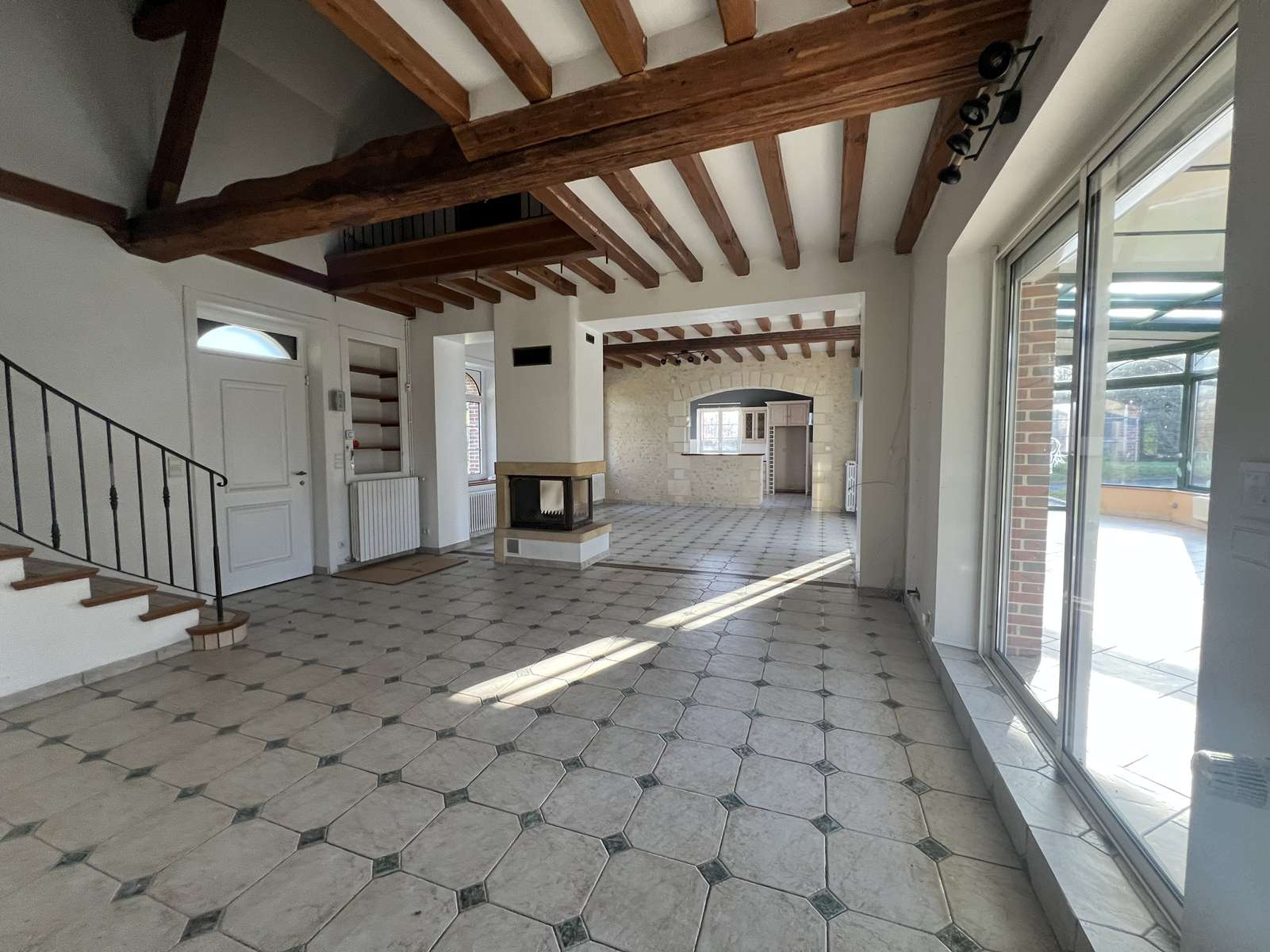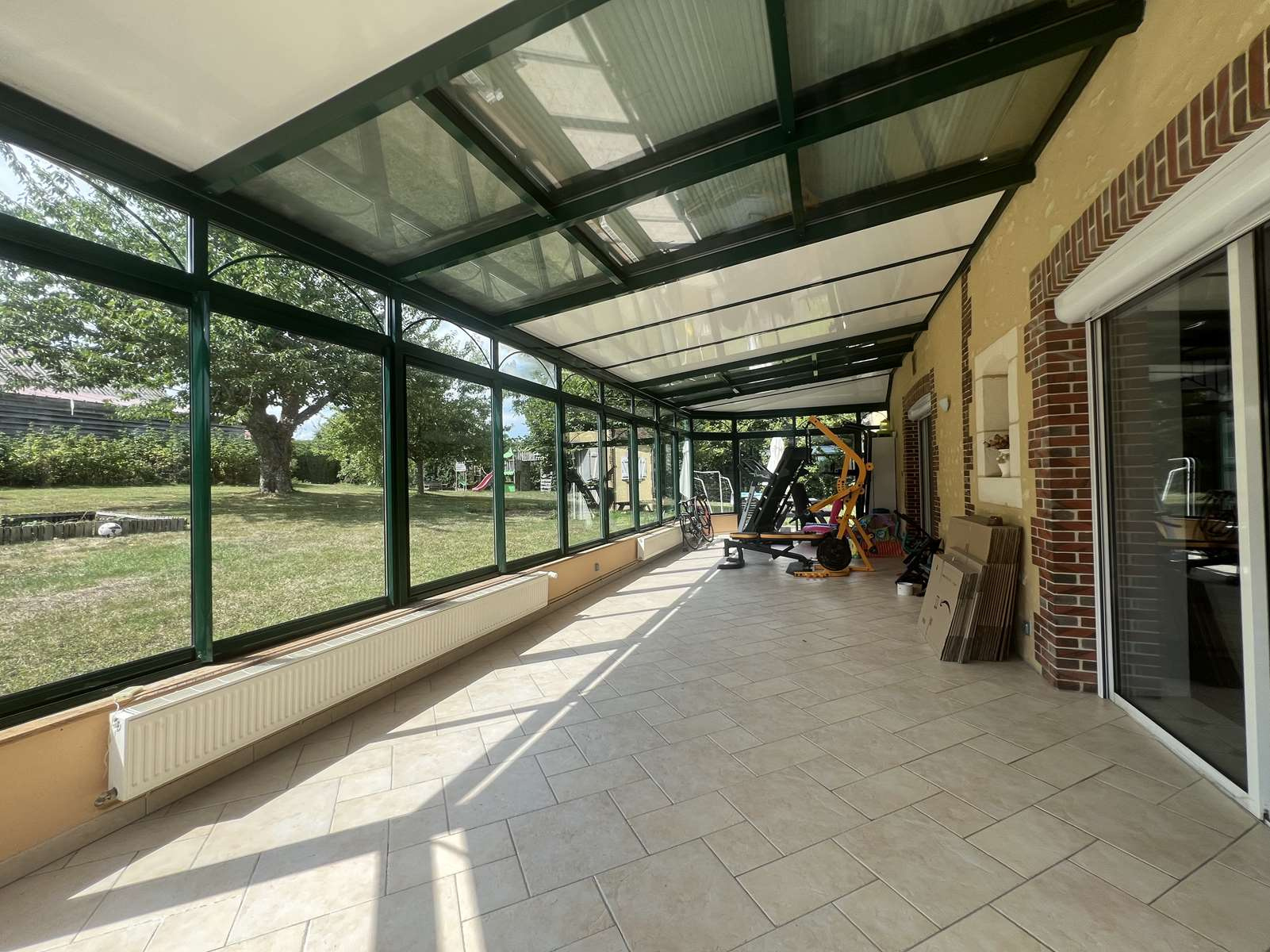 cuisine aménagée et équipée semi ouverte sur un vaste séjour / salon avec cheminée, grande véranda, dégagement, chambre, wc, salle de bains avec wc, buanderie/chaufferie.