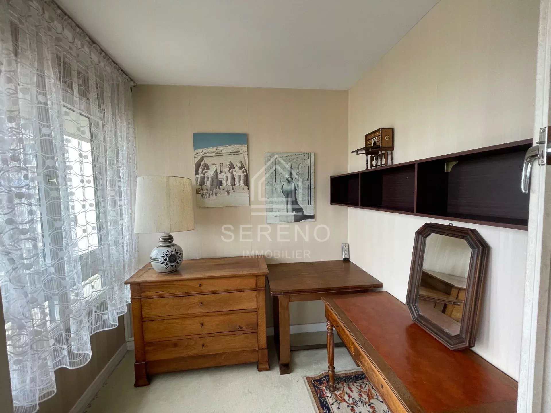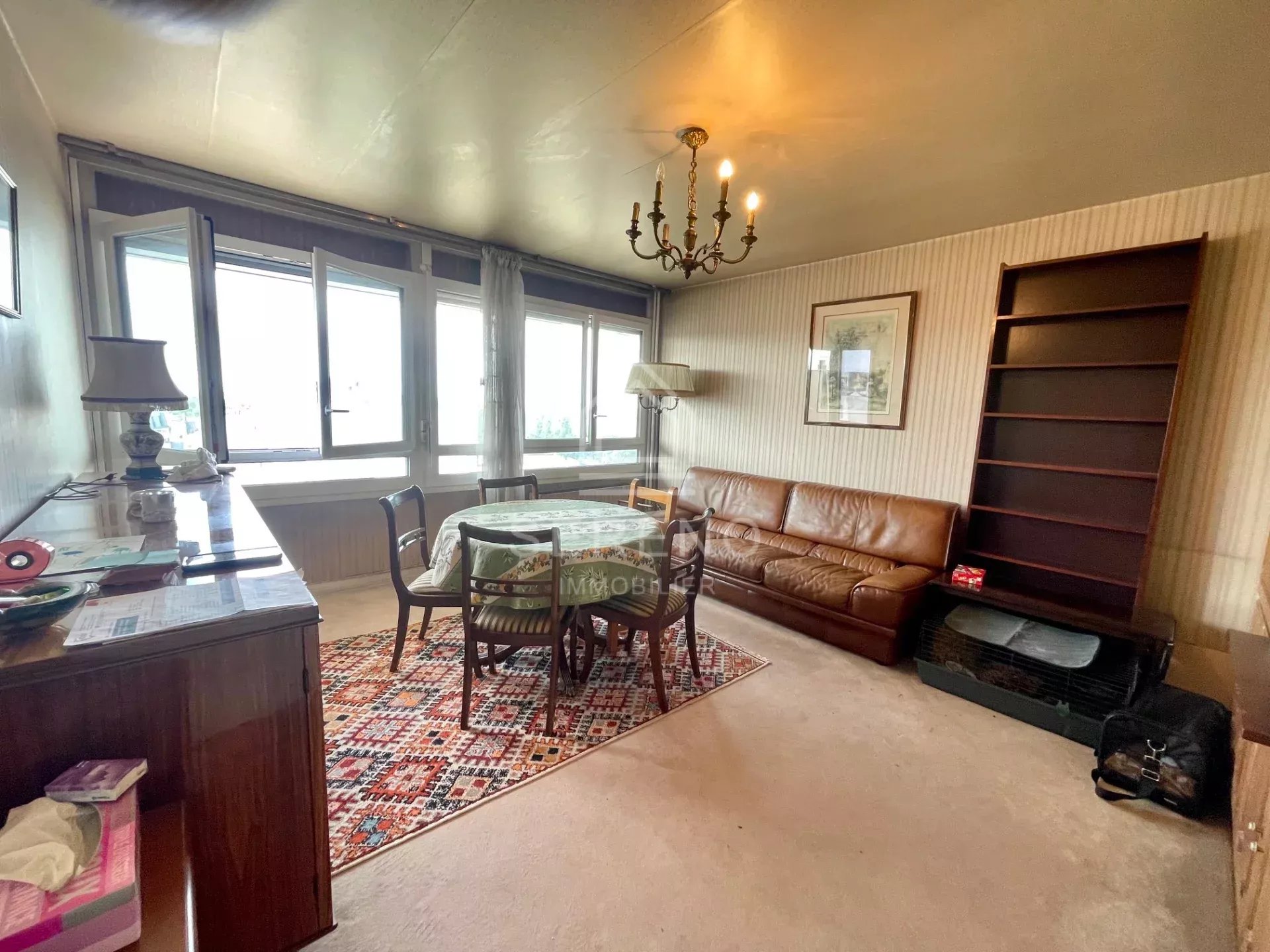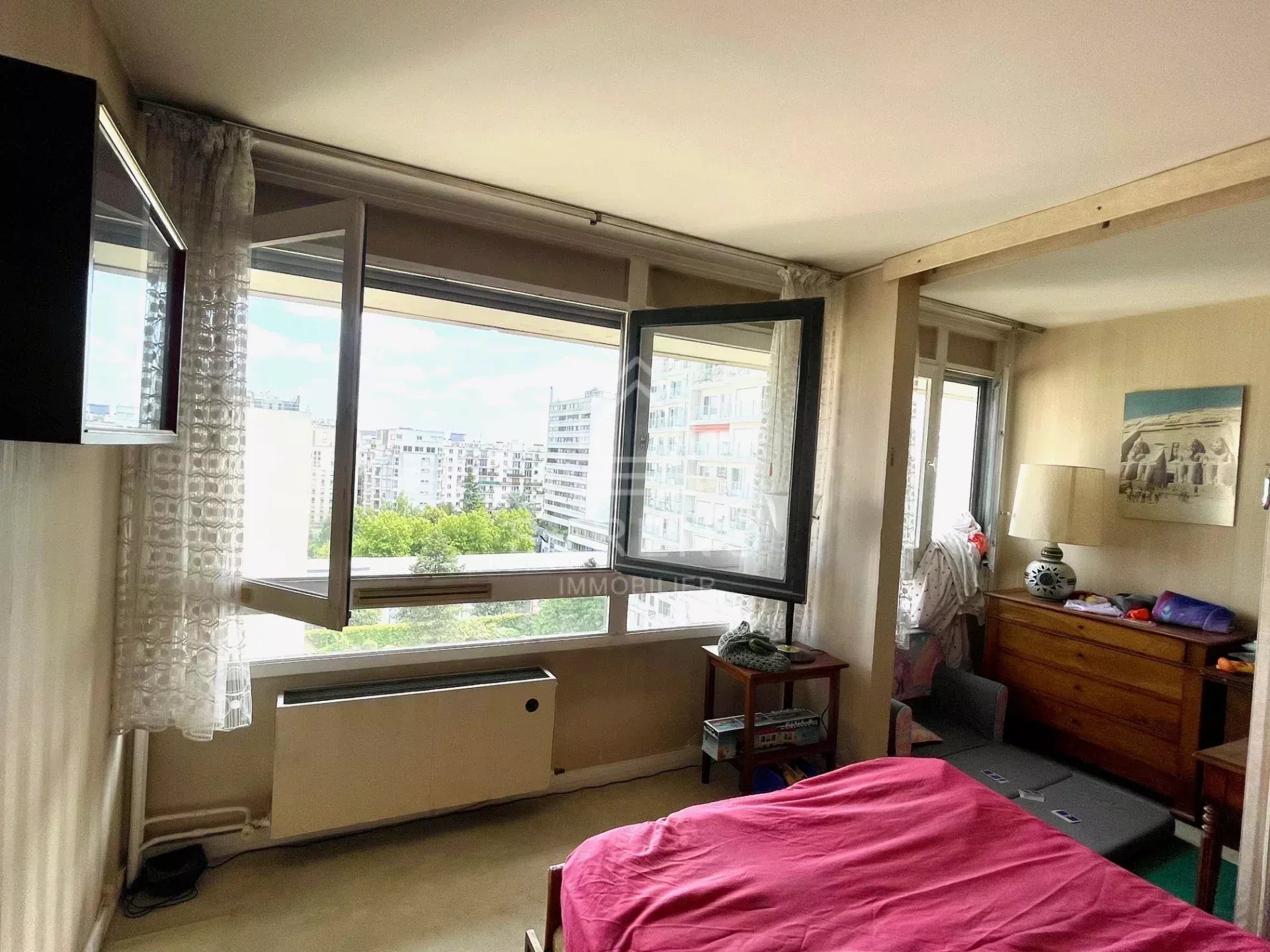 SERENO vous propose : A Paris 19è, Quai de la Loire, proche Jaurès, dans un immeuble année 1970, bien entretenu, 9è étage, clair, traversant, vues imprenables sur Paris, Montmartre, Tour Eiffel, trois pièces à rénover, comportant entrée avec placards, dressing et dégagement,cuisine aménagée équipée à rénover, séjour, une chambre, avec accès salle d’eau, et toilettes séparées, cuvette neuve, une chambre avec alcôve annexe,une cave et un emplacement de parking, voiture moyenne, hauteur 1,90 m, des jardins collectifs complètent ce bien.
