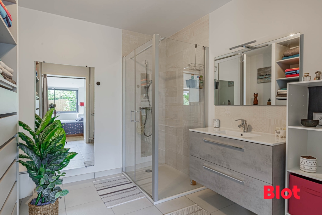 Sur le même niveau vous trouverez, pour une vie de plain-pied, une chambre avec sa partie dressing, sa salle d'eau et ses toilettes.
