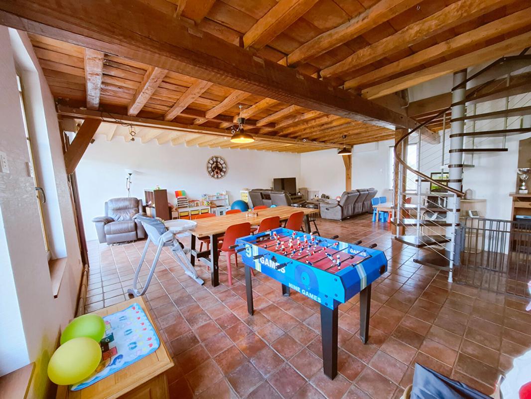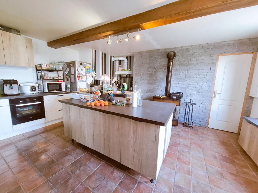 A l'intérieur, l'ambiance chaleureuse est immédiatement au rendez-vous. L'entrée avec rangements s'ouvre sur un vaste salon-séjour de plus de 50 m², baigné de lumière, avec poutres apparentes et tomettes au sol. La cuisine aménagée et équipée prolonge harmonieusement cet espace de vie.