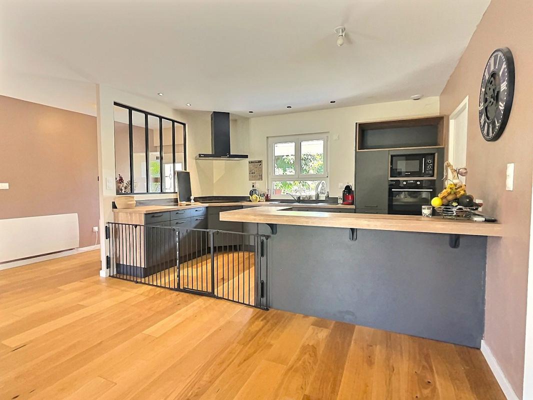 Une belle pièce de vie principale avec cuisine ouverte, aménagée et équipée, un dégagement desservant 4 chambres dont une suite parentale + 1 salle de bains, 2 autres chambres et une chambre d'appoint avec salle d'eau + wc. Un cellier et un wc séparé.
