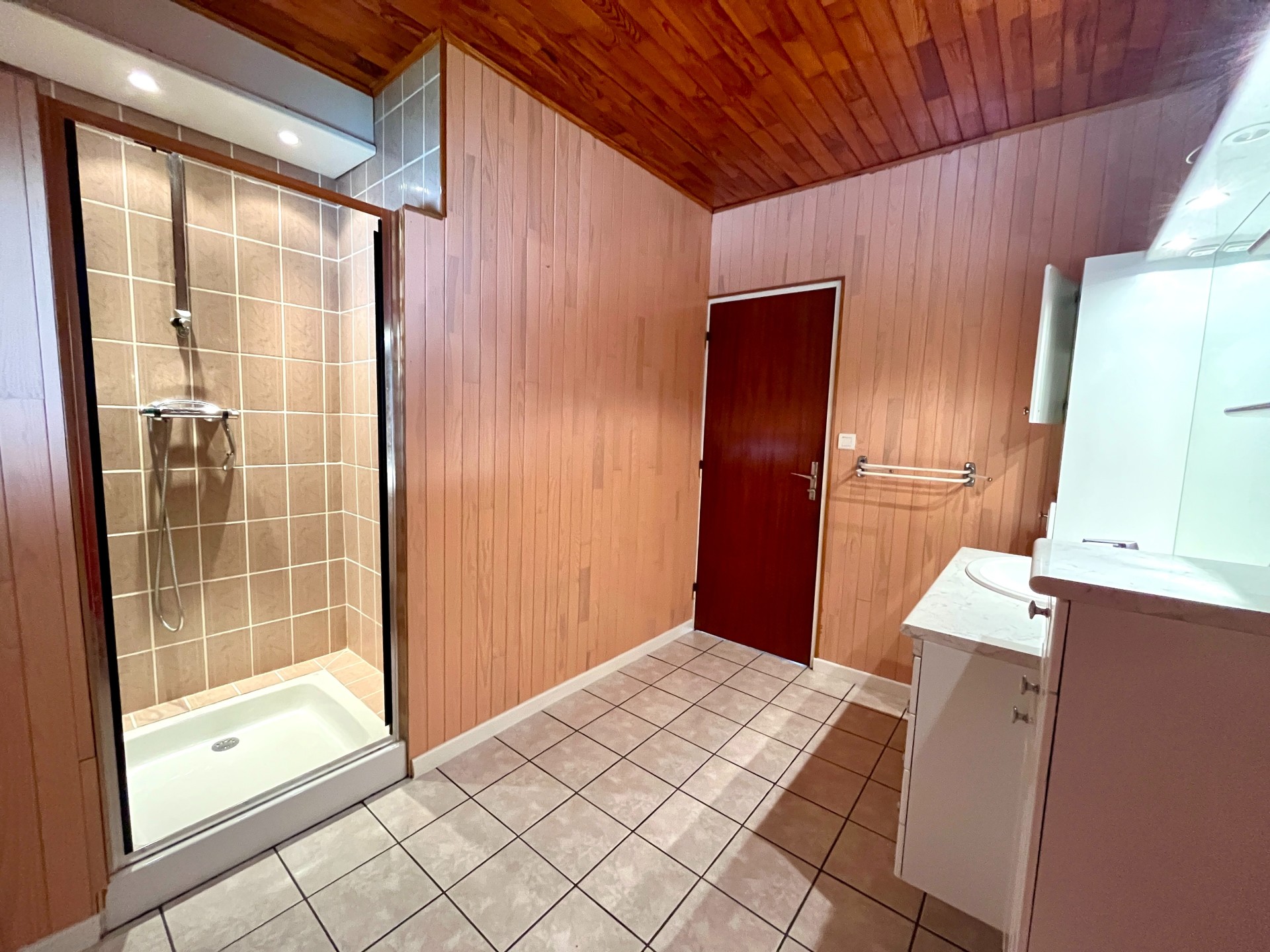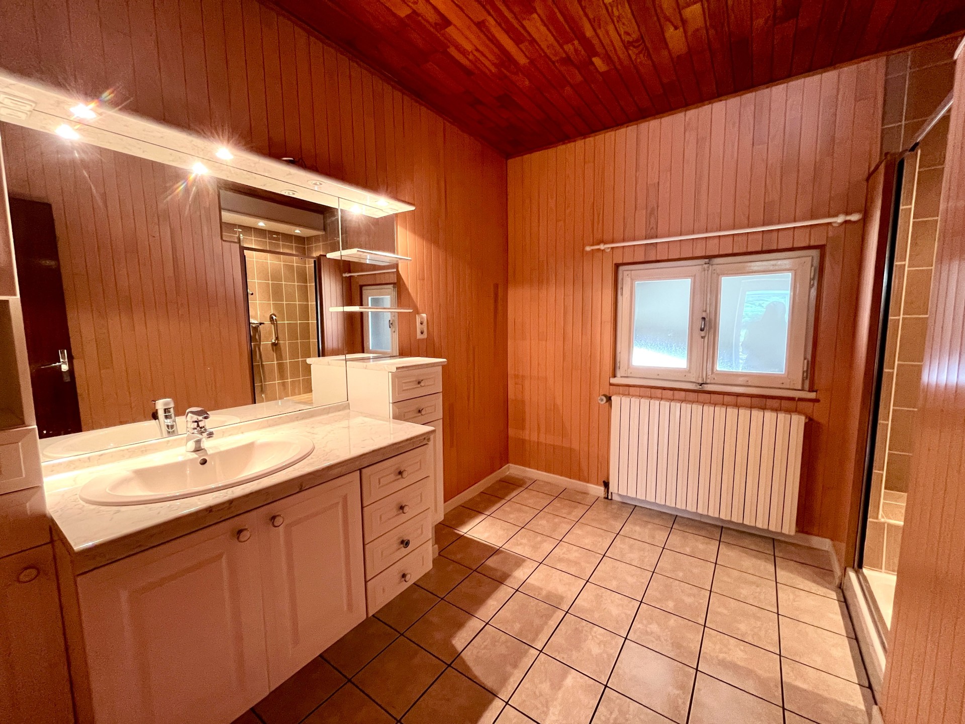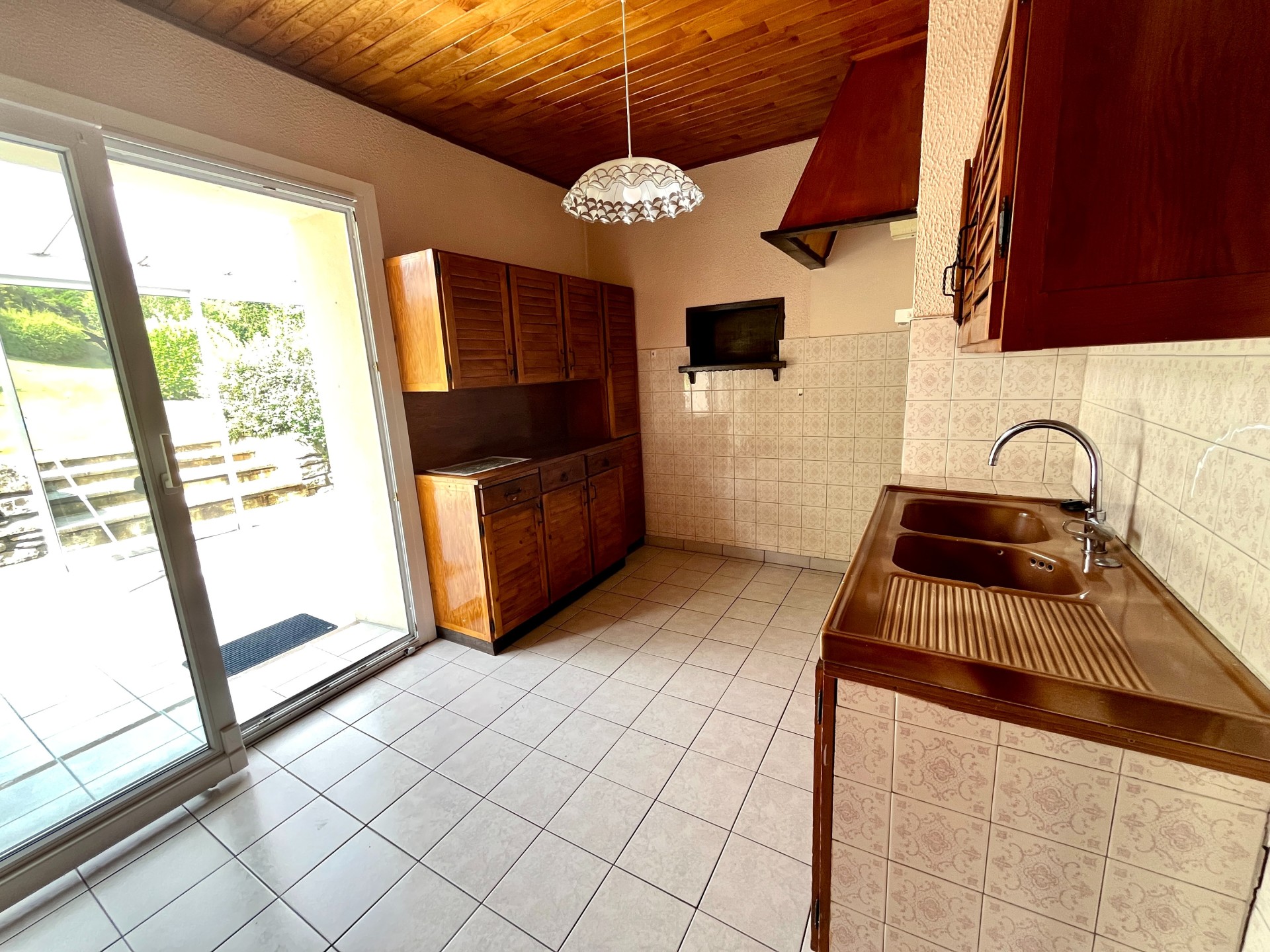 - quelques marches pour rejoindre la cuisine partiellement aménagée avec un accès à une belle véranda et une terrasse de 20 m2 vue sur le parc arboré , 2 chambres dont 1 avec placards , salle de bain avec douche , WC indépendant