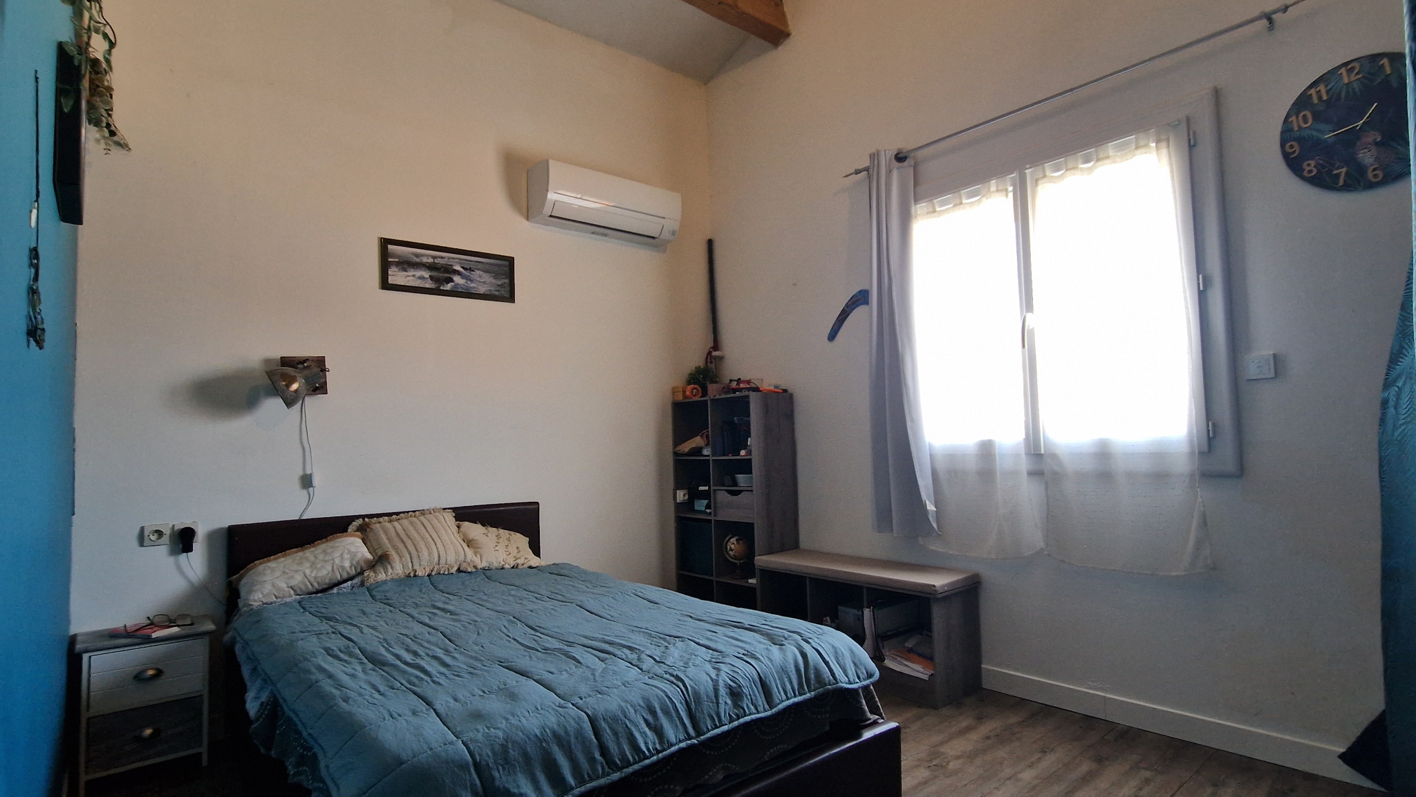 La maison principale se compose d'une grande pièce principale de 55m2 avec grand volume, belle charpente apparente, déco pierre, deux chambres et une salle d'eau avec wc et une terrasse couverte - Menuiseries PVC double vitrage + volets roulants électriques, climatisation reversible + poèle à bois, panneaux solaires permettant de produire une bonne partie de l'électricité
