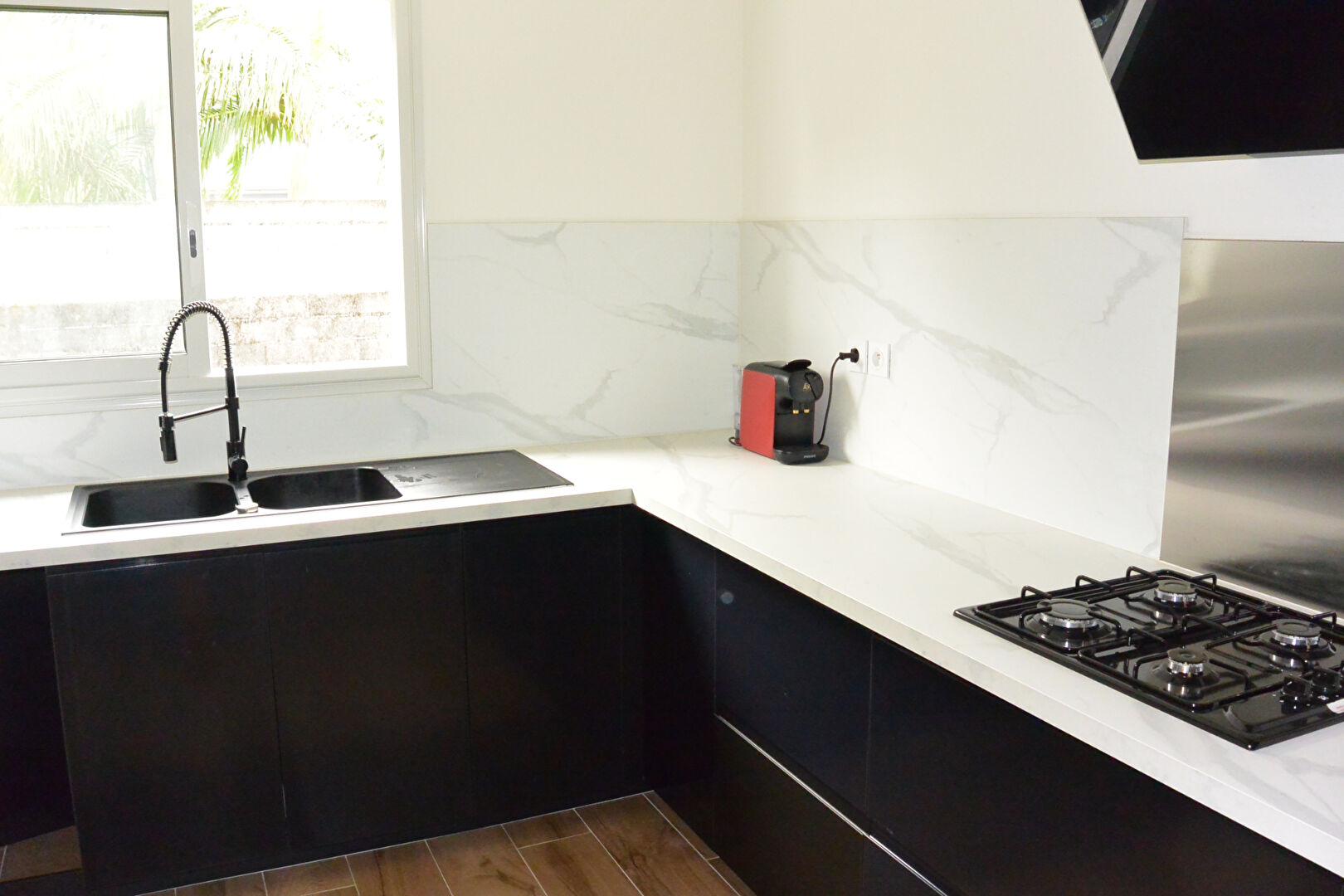 -en rez-de-chaussée : salon/salle à manger avec accès direct sur varangue, cuisine ouverte aménagée et semi-équipée, 1 grande chambre, 1 salle d'eau avec douche à l'italienne, WC séparés.