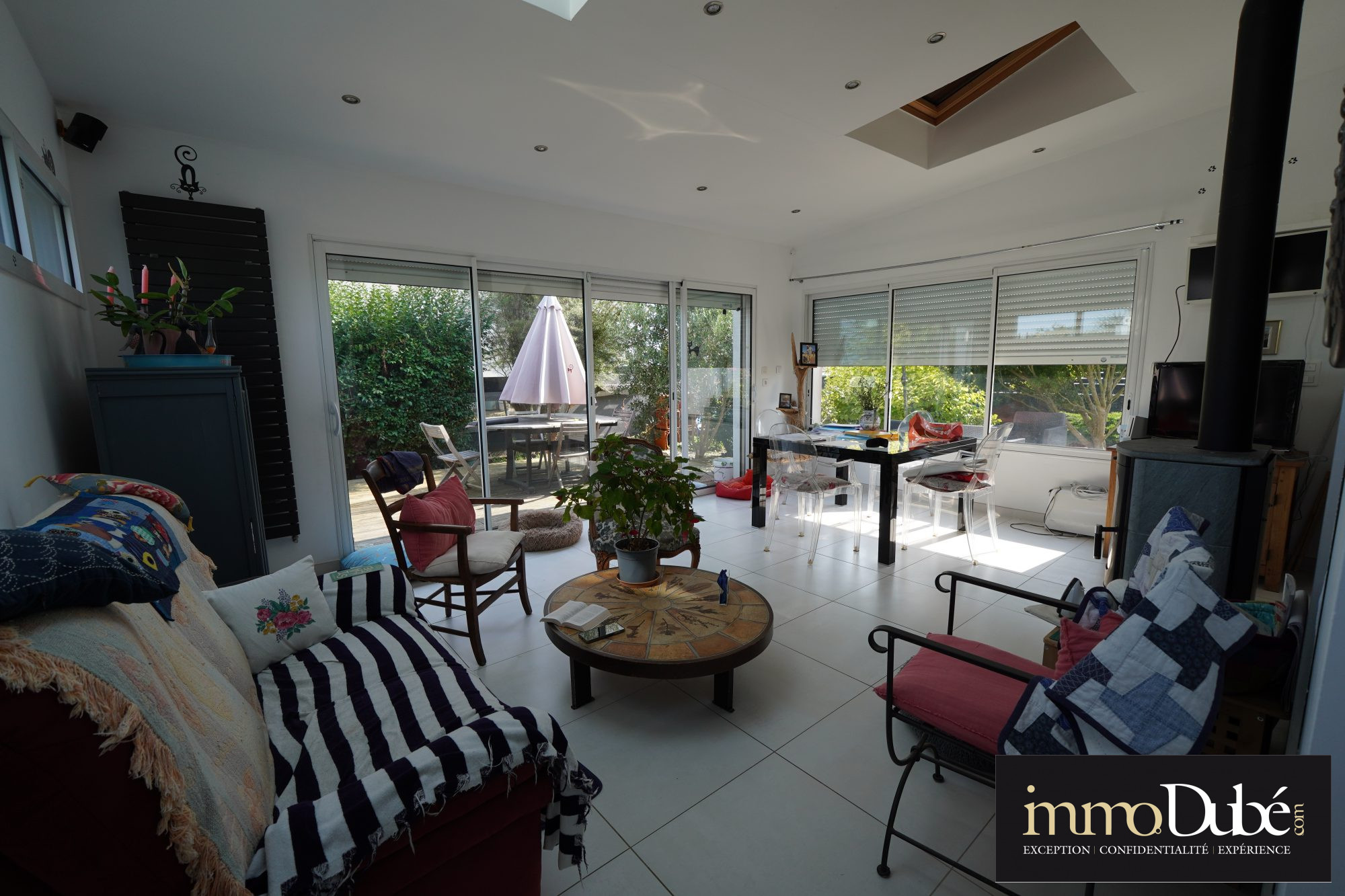 Le salon équipé d'un poêle à bois, bénéficie d'une triple exposition : Est-Sud et Ouest et d'un accès aux terrasses et jardin.
