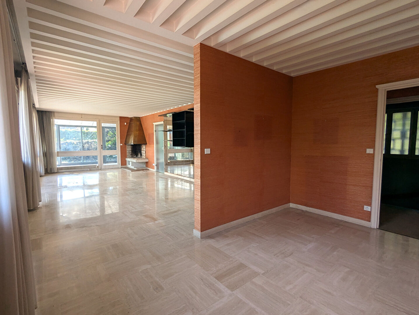 Séjour lumineux de 50 m², agrémenté d'une cheminée et de grandes baies vitrées ouvrant sur la piscine.