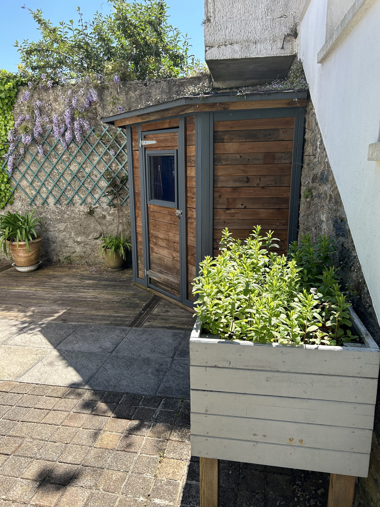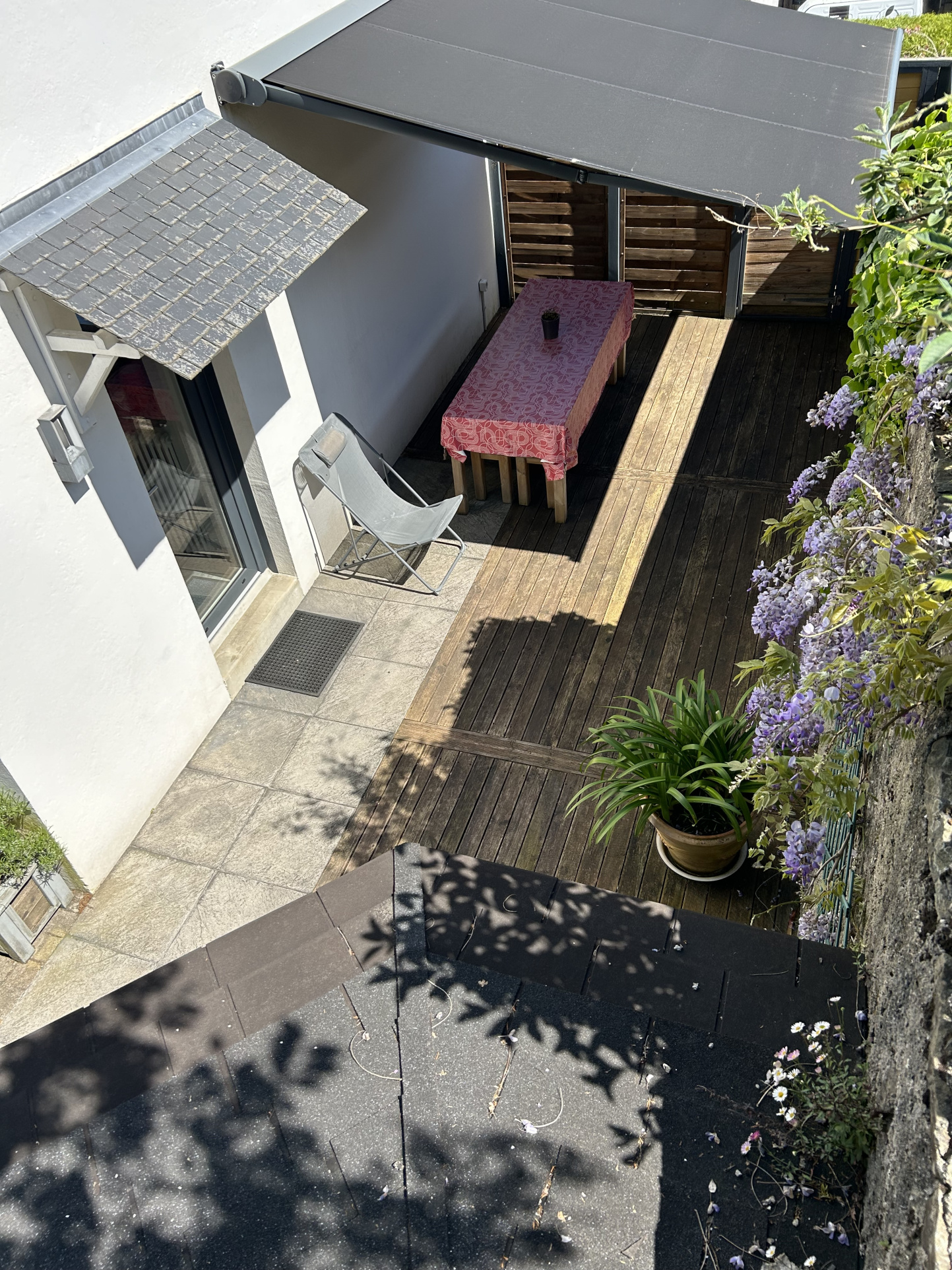 Morlaix, en exclusivité, dans un quartier calme à moins de 5 minutes à pied du marché et du centre-ville , maison atypique de 70 m2. Son rez-de-chaussée est une pièce de vie de plus de 30 m2 traversante avec espace cuisine aménagée, et des toilettes. Au-dessus, le palier distribue deux chambres, un bureau et une salle de bains. En dessous, un dressing avec lavabo et un cellier/buanderie avec accès extérieur complètent ce bien. Espace clos, avec grande terrasse orientée sud sans vis-à-vis et cabanon. Stationnement tout proche. Découvrez le charme des années 50 à l'abri des regards.