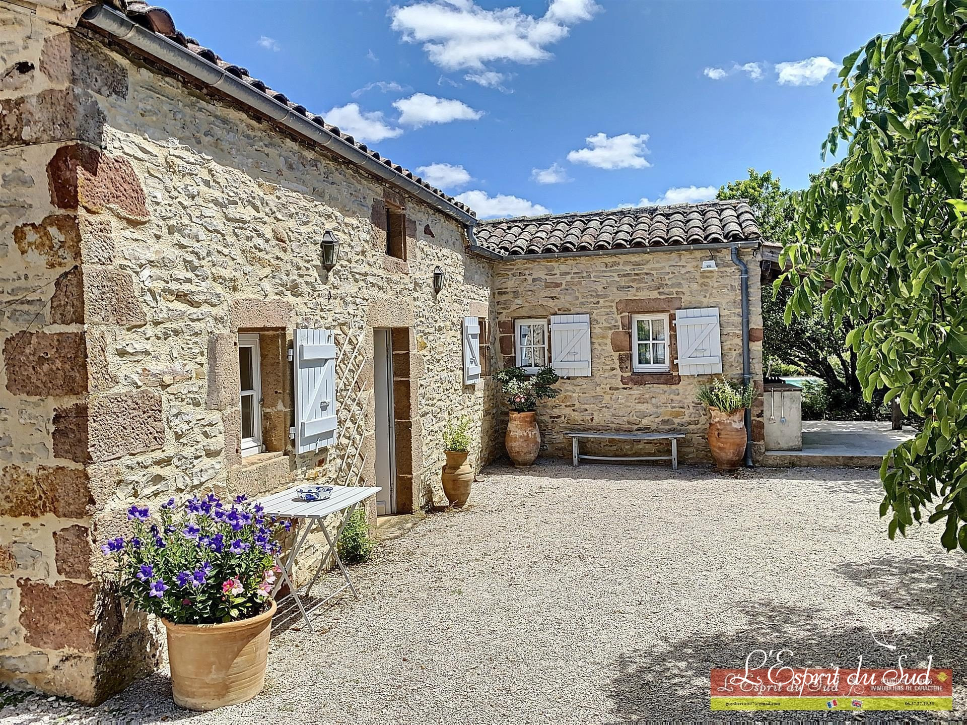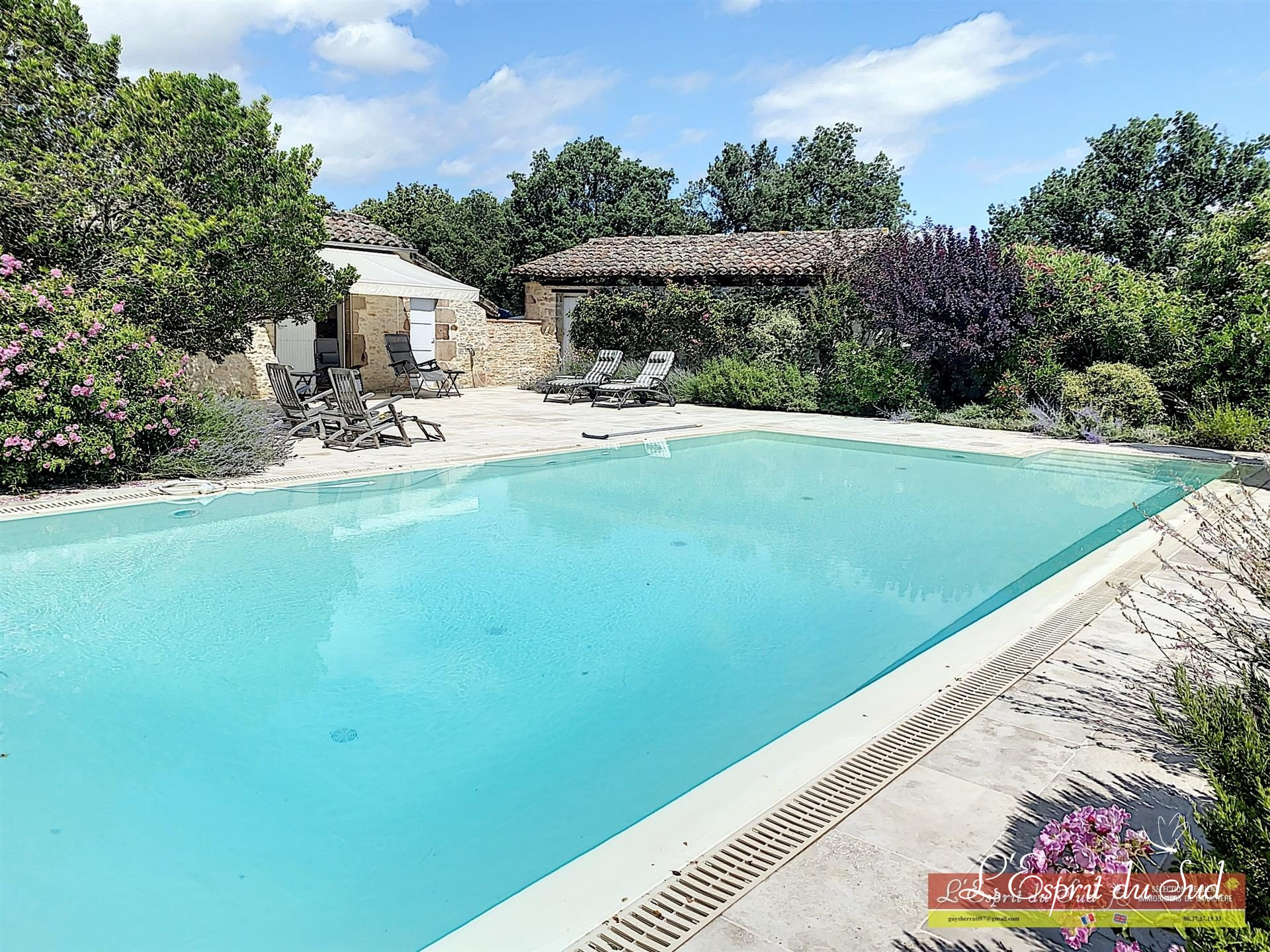 Dans les environs de Cordes, une maison en pierre magnifiquement rénovée de 6 chambres (310m2) située dans une position dominante avec 3 salles de réception/bureau, un studio séparé (27m2), une grande piscine d'eau salée (12m x 6m) avec des terrasses, des salles à manger couvertes, un abri pour deux voitures, des jardins et un terrain d'environ 7980m2 sans voisins.