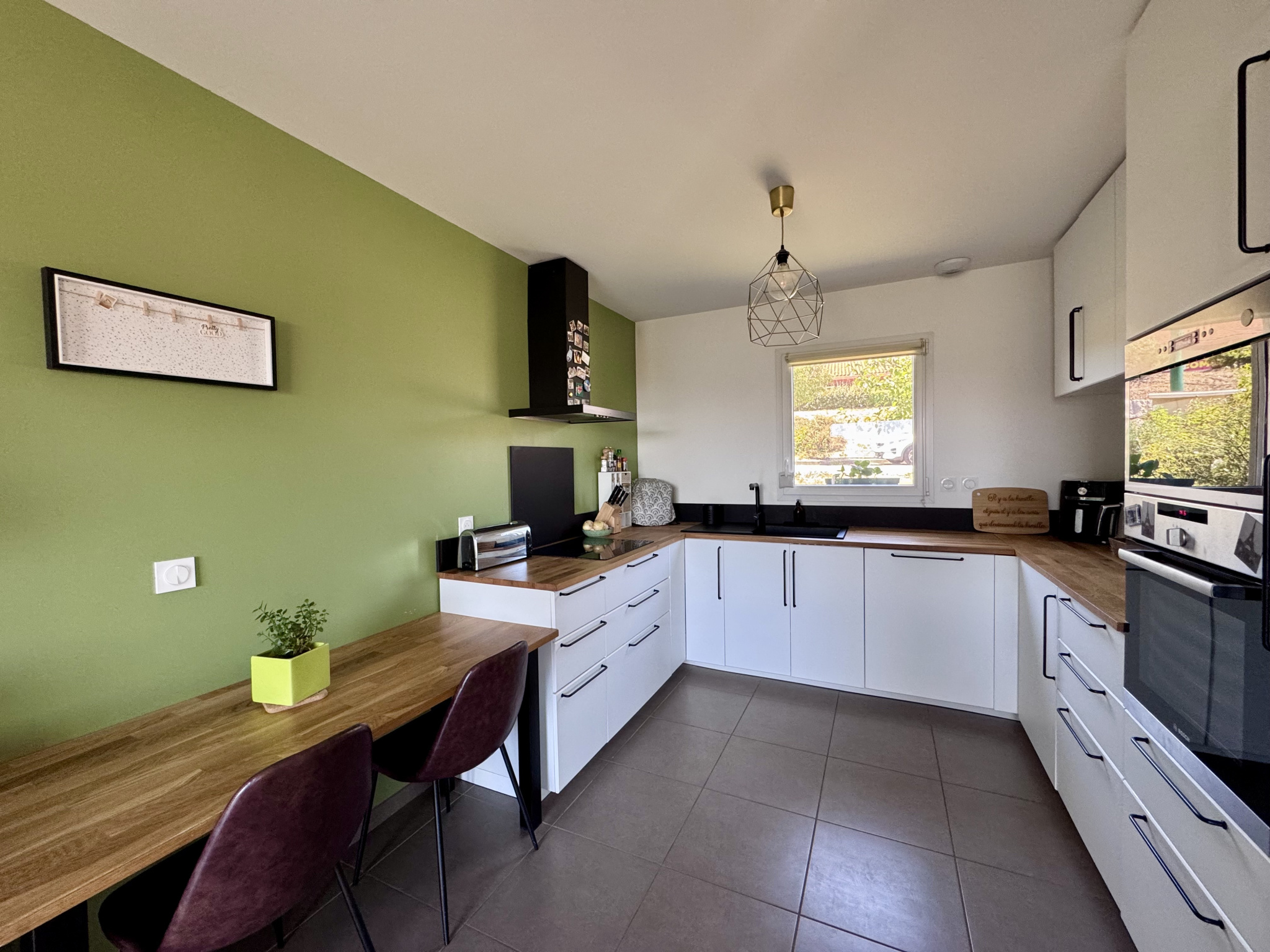 Demi-niveau inférieur : Spacieuse cuisine meublée et équipée (hotte à filtration, micro-ondes, four, réfrigérateur, lave-vaisselle) de 9,39 m2, ouverte sur un lumineux salon/séjour de 27,8 m2 donnant sur la terrasse et le jardin.