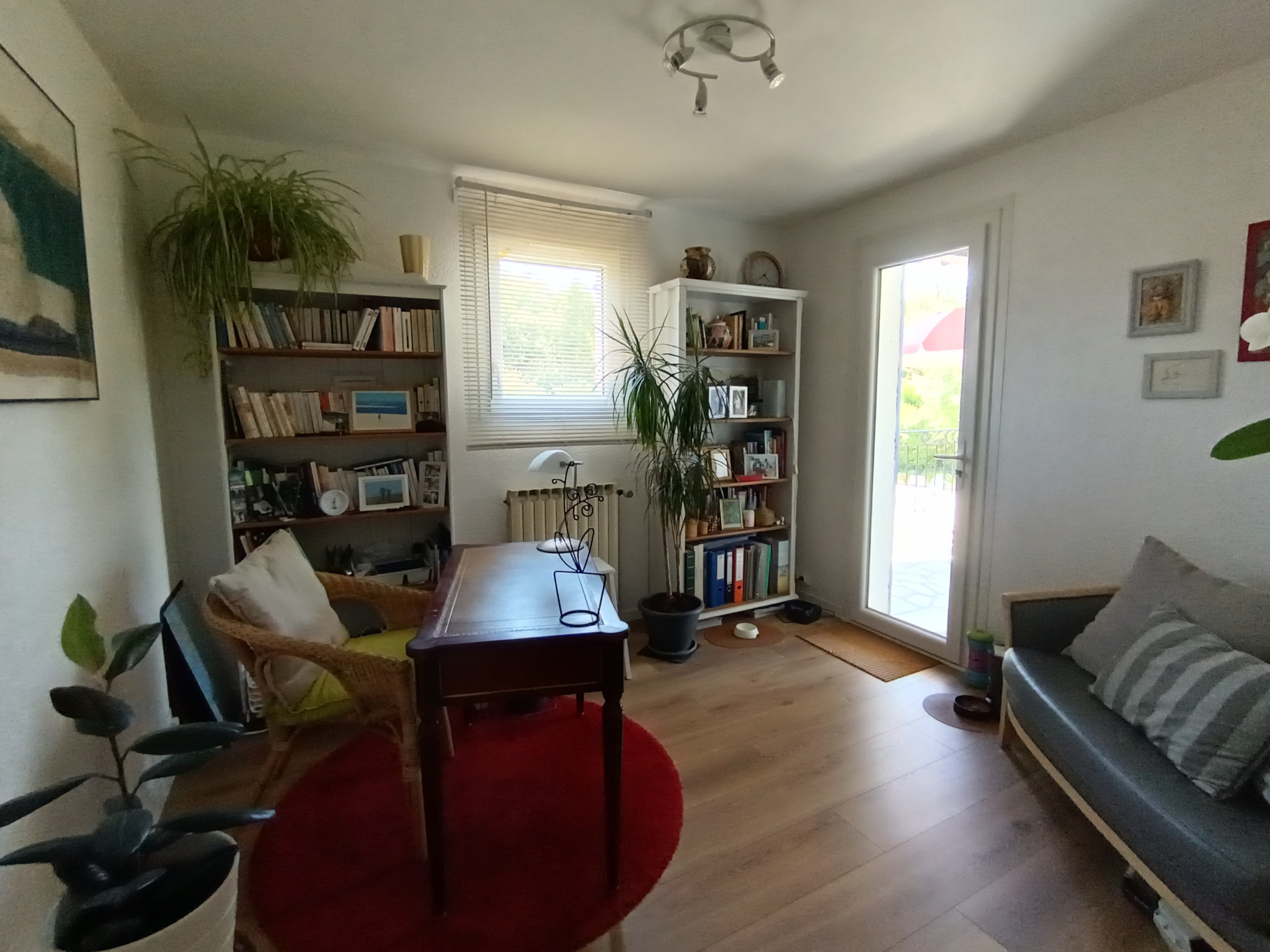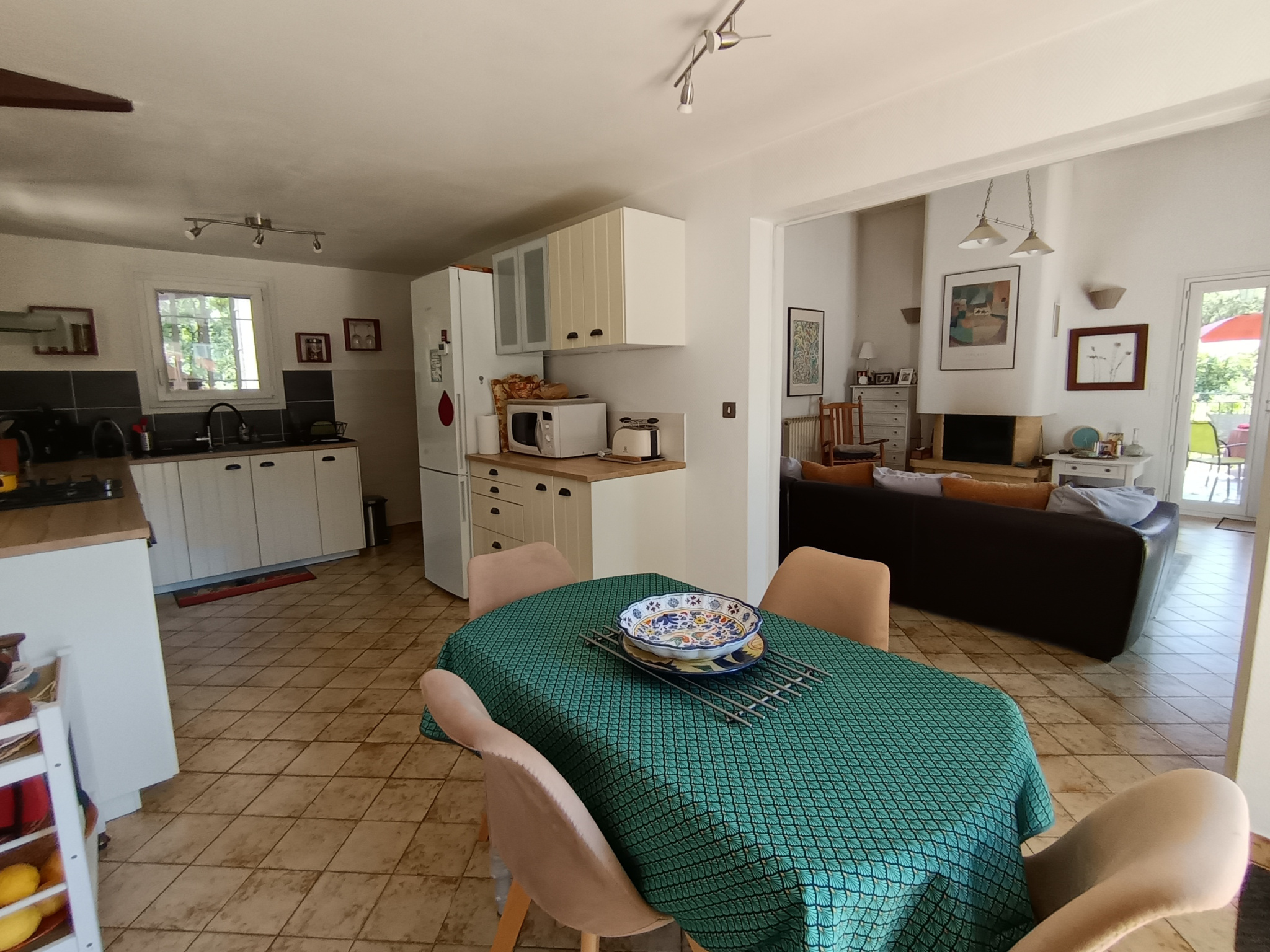La maison se compose, au rez-de-chaussée, d'un salon lumineux, d'une cuisine et d'un hall ouverts, de trois chambres, d'une salle de bain et de toilettes indépendantes. À l'étage, une grande chambre mansardée climatisée offre également un espace bureau, une salle d'eau et des toilettes.