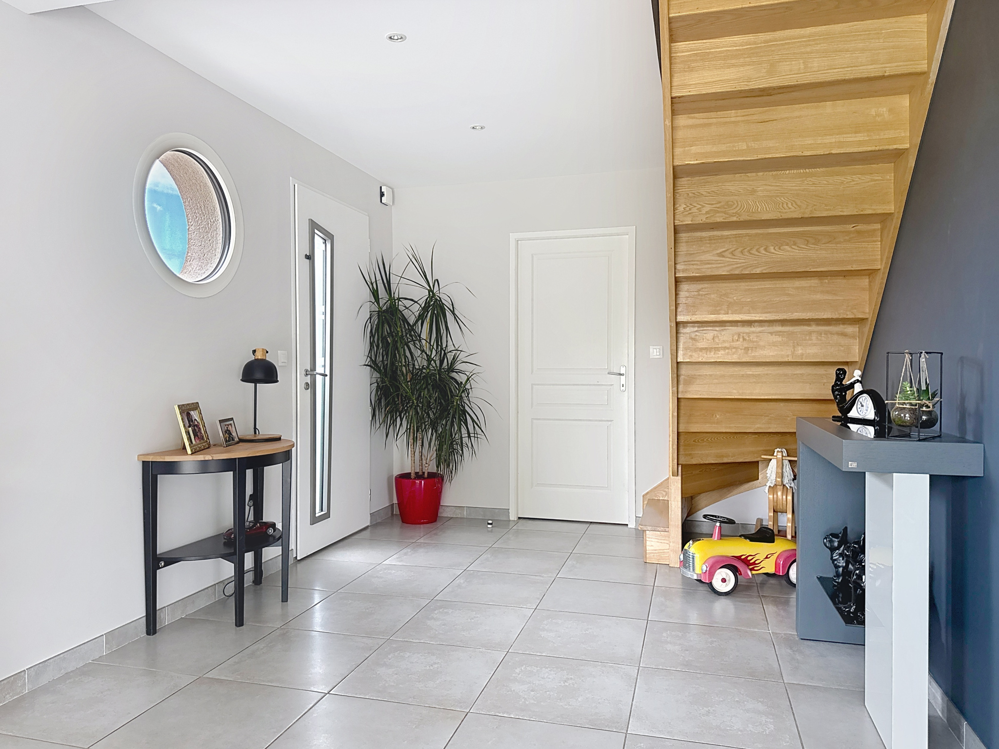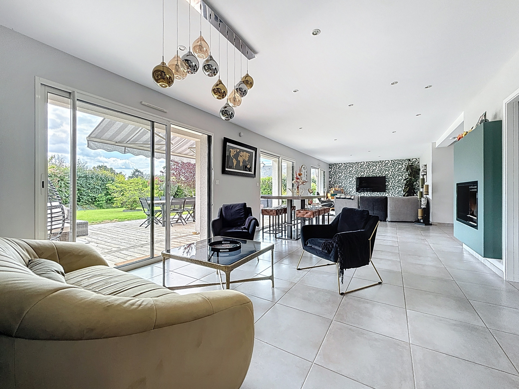 Dès l'entrée, vous serez séduit par le volume et la luminosité de l'espace de vie avec une cheminée, largement ouvert sur une cuisine moderne, aménagée et entièrement équipée.