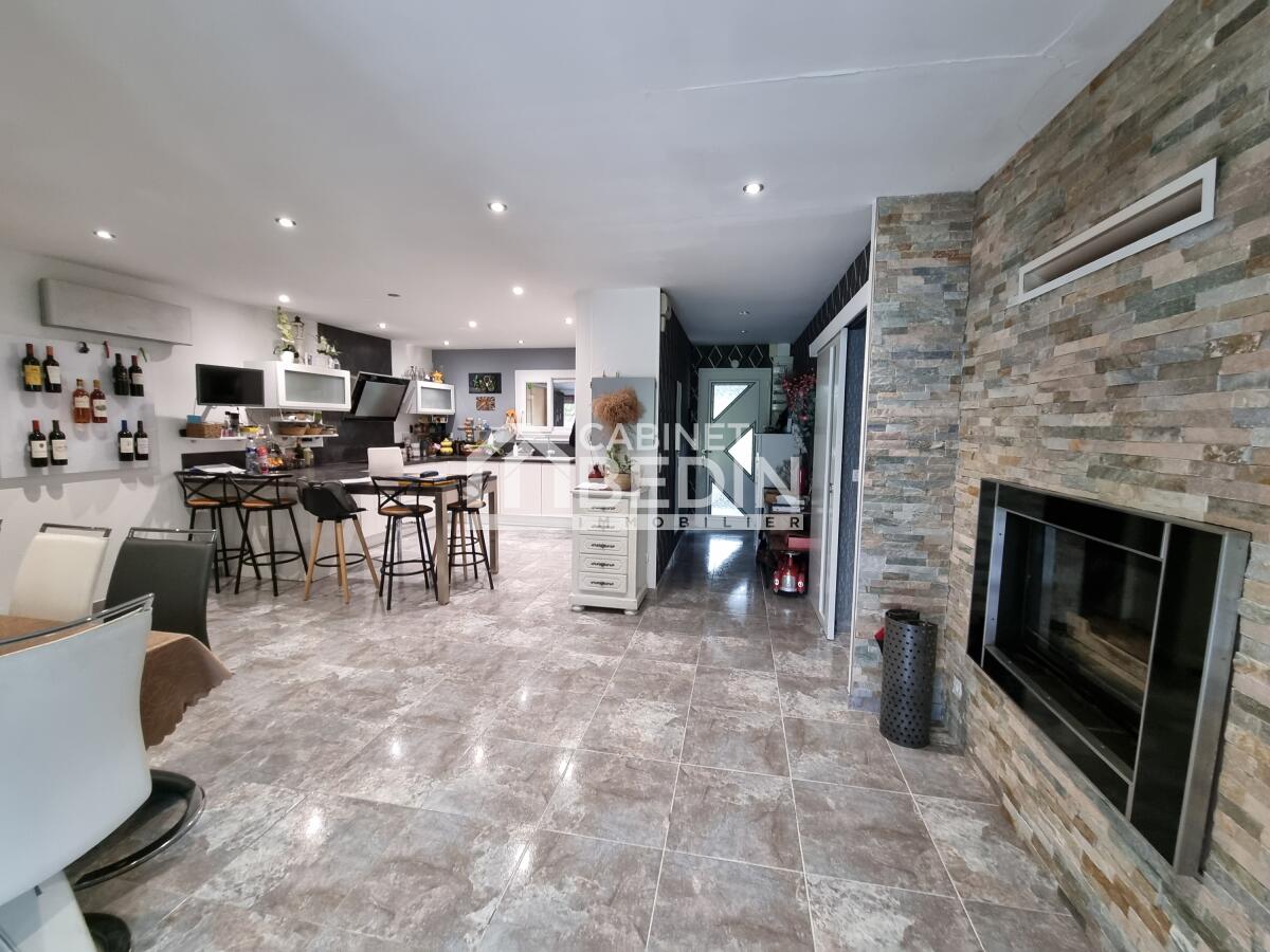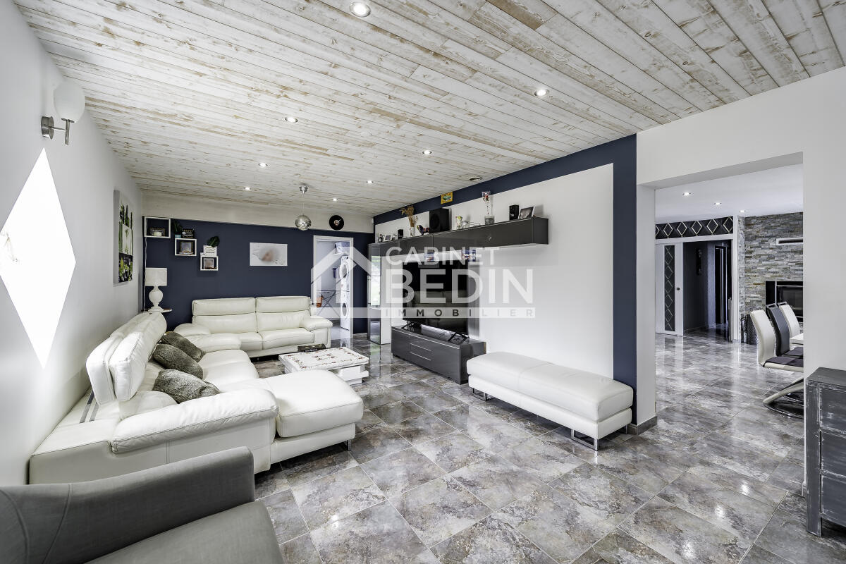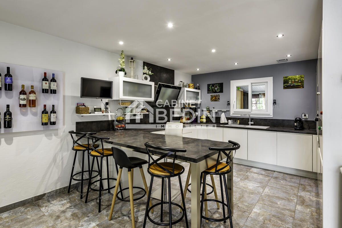 Exclusivité CABINET BEDIN - Villa à Lagorce, Piscine et Garage. Située à la campagne, cette maison de plain-pied de 172 m² s'étend sur une parcelle de 5 000 m², complétée par un pré de plus de 1,6 hectare. Son architecture simple et élégante s'intègre harmonieusement dans un cadre verdoyant, offrant une vue dégagée sur la campagne environnante. Spacieuse et lumineuse, elle propose de vastes espaces : cuisine ouverte sur le séjour, idéale pour la vie familiale, grand salon/salle de jeux, trois chambres, salle de bain neuve. Elle dispose d'un insert et d'une pompe à chaleur pour un confort optimal en toute saison. Les volumes permettent des aménagements variés : chambres, bureau ou dressing. Garage, cave et parking extérieur goudronné complètent ce bien pratique au quotidien. À l'extérieur, jardin d'agrément, terrain de pétanque, terrasses aménagées avec espace barbecue fermé, piscine couverte et chauffée invitent à la détente. Le terrain bien exposé offre de nombreuses possibilités : potager, verger ou coin salon farniente. Une maison idéale pour une famille recherchant espace, confort et tranquillité, tout en restant proche de Coutras et Libourne.