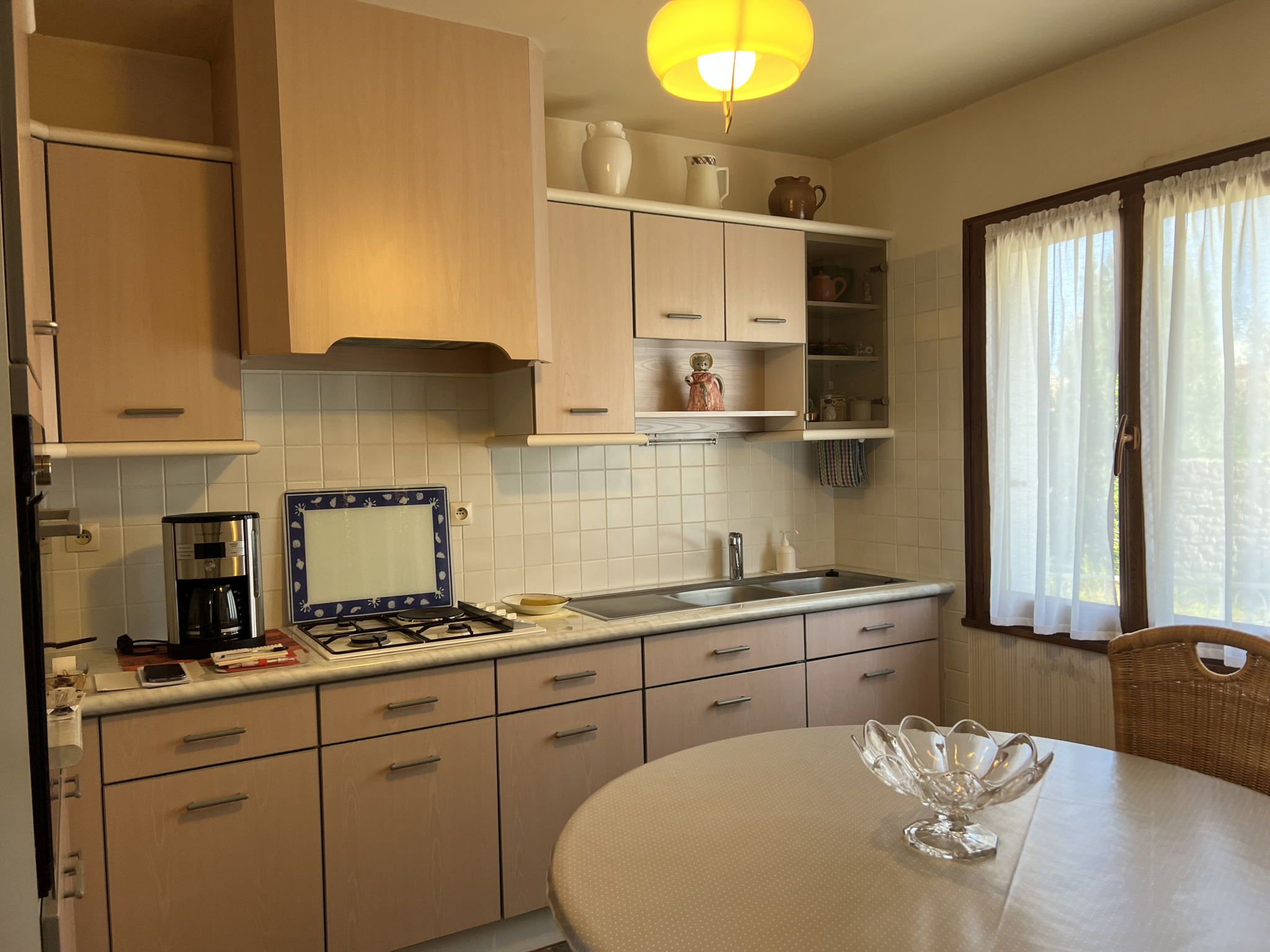 Au rez-de-chaussée : entrée, WC, lave mains, une cuisine aménagée, un séjour de 35 m2 avec cheminée insert ouvrant sur terrasse, dégagement avec nombreux placards, une salle de bains, un bureau, deux chambres.