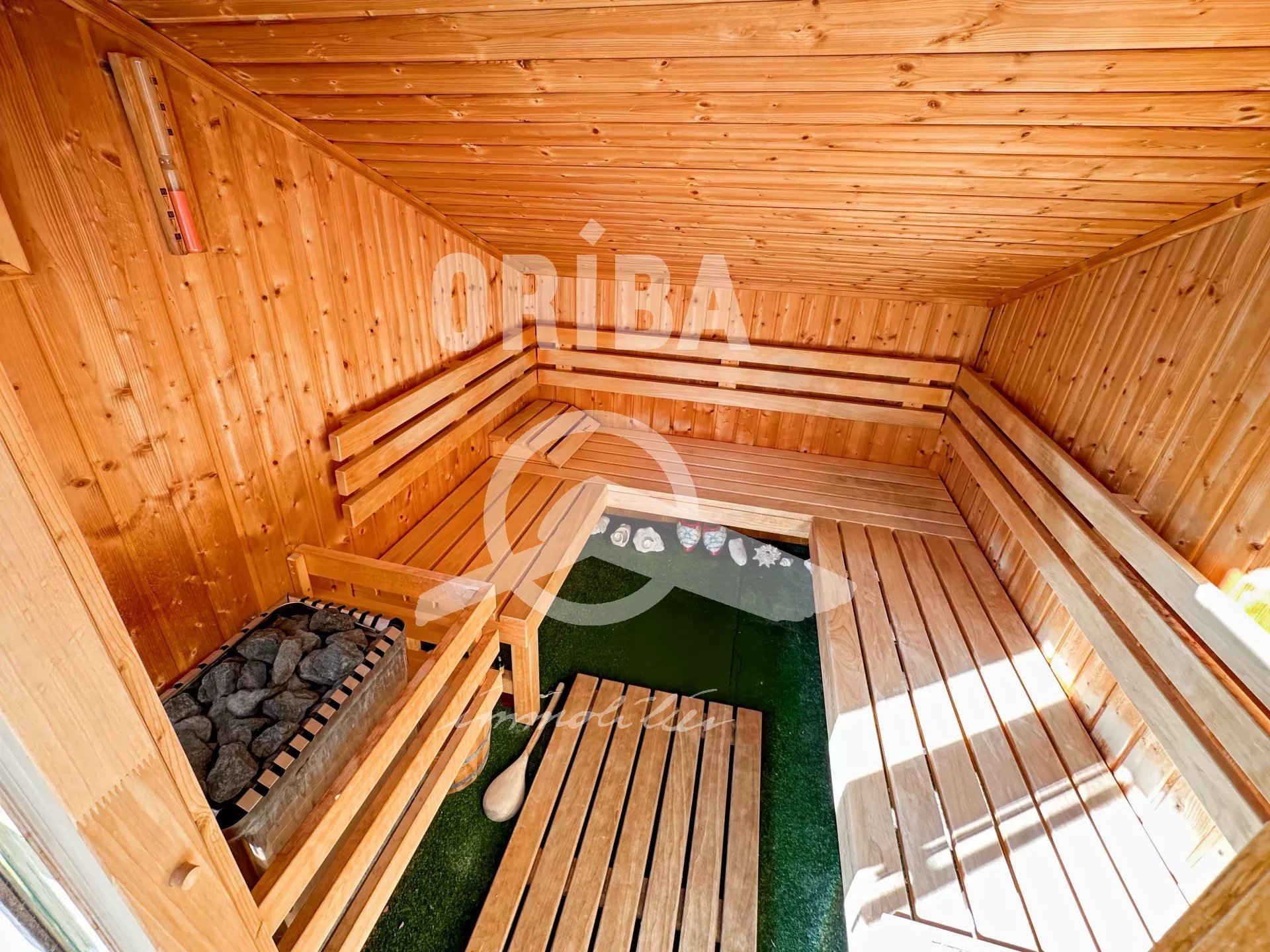 La suite parentale vous offre un véritable cocon de bien-être avec salle d’eau, WC, dressing aménagé, terrasse privative et sauna, le tout avec une vue dégagée sur le jardin.