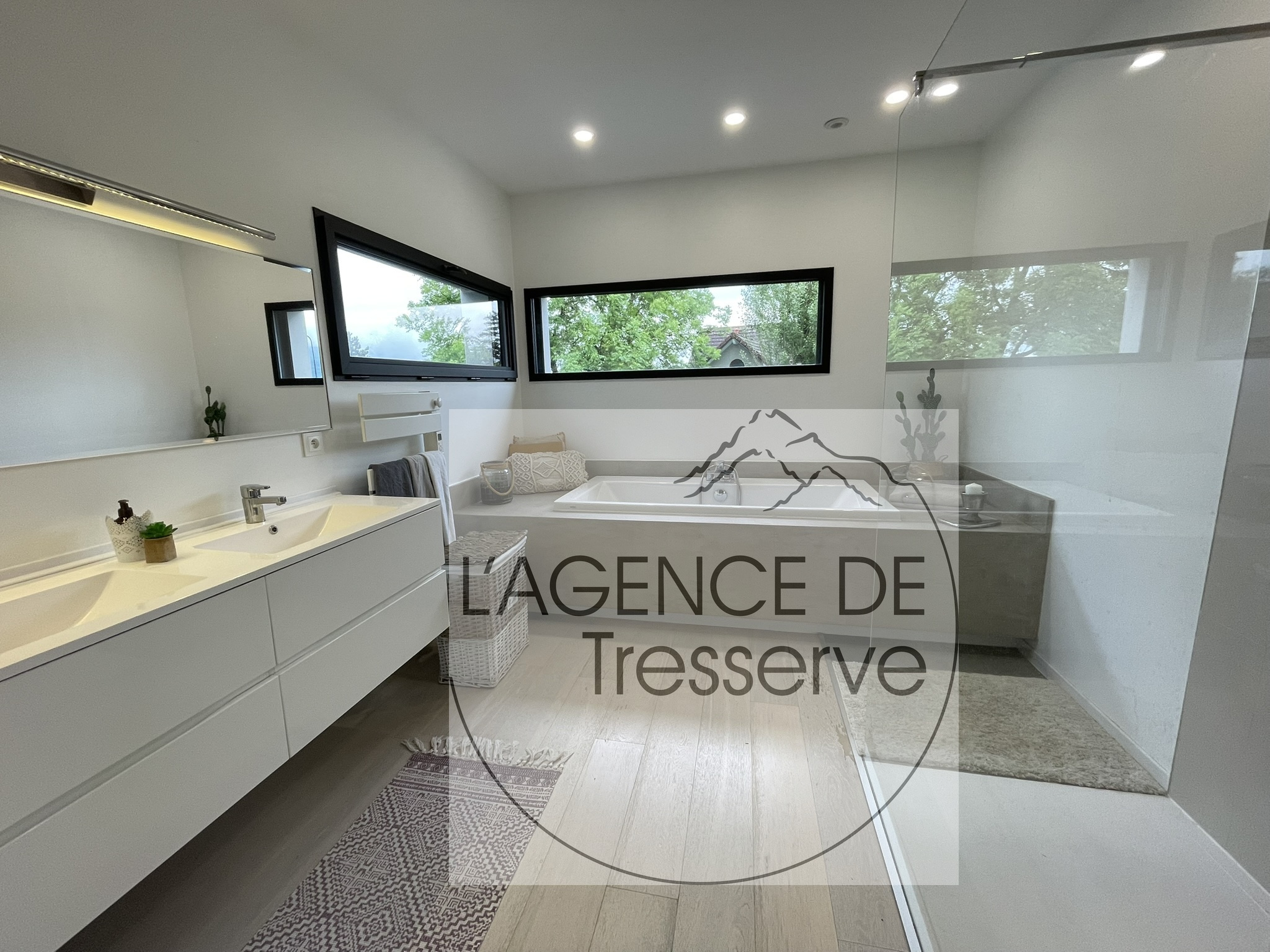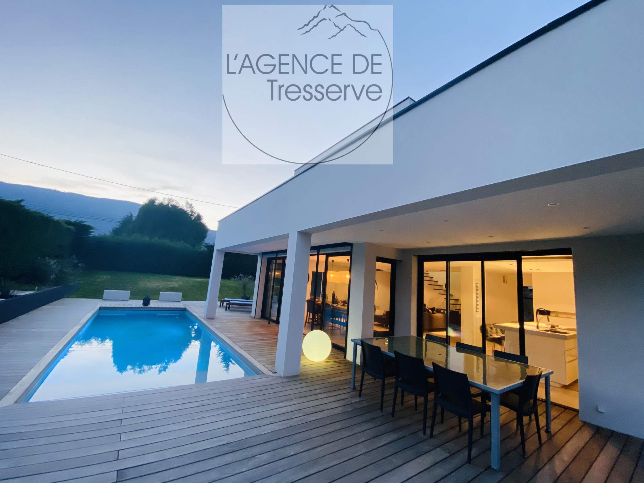 Aux abords du Lac du Bourget, sur la commune de Tresserve, à côté d'Aix les Bains, cette villa, construite en 2017 sur deux niveaux, offre, au rez de chaussée, un salon de plus de 55m2 avec cuisine totalement équipée, le tout donnant sur une terrasse ombragée, agrémentée d'une piscine. Une suite parentale donnant également sur le jardin, avec dressing et salle d'alle d'eau privative. Au rez de chaussée également, wc et espace de rangement pour manteaux et chaussures, un petit bureau, une buanderie. A l'étage, trois belles chambres, dont deux avec terrasses. Une salle de bains avec douche. Garage attenant. Le tout sur un terrain de 991m2. Cheminée insert dans le salon, chauffage par pompe à chaleur et climatisation réversible, eau chauffée par un ballon thermodynamique, système domotique, maison très bien isolée. Taxe foncière: 2200EUR/an. Le prix inclut tout le mobilier si besoin.