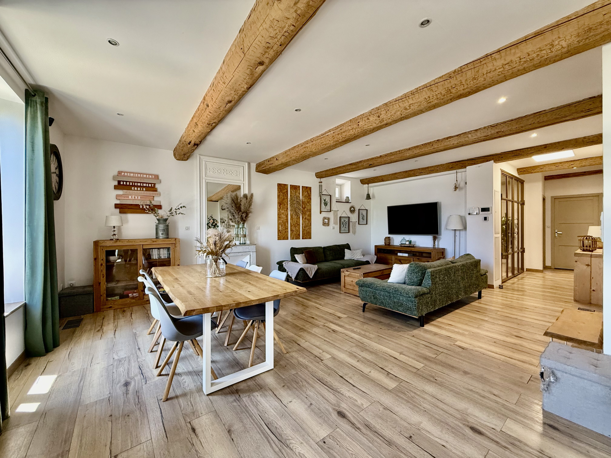 À l'étage, un hall d'entrée baigné de lumière grâce à une élégante verrière mène à une spacieuse pièce de vie d'environ 50 m2. La cuisine, ouverte et entièrement équipée, s'intègre harmonieusement à l'espace salon-séjour, où les poutres apparentes et la hauteur sous plafond de 2,80 m créent une atmosphère à la fois raffinée et authentique. L'espace nuit se compose d'une suite parentale avec baignoire, douche à l'italienne, meuble double vasque et dressing sur mesure, ainsi que de deux autres chambres avec rangements intégrés. Une salle d'eau indépendante avec douche à l'italienne, meuble vasque et WC complète ce niveau.