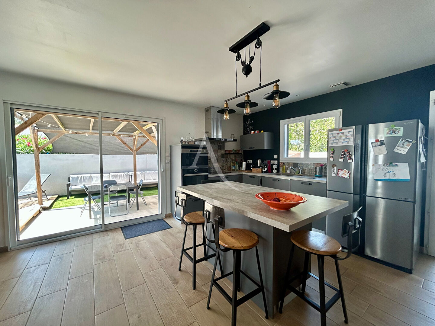 Au rez-de-chaussée, une spacieuse pièce de vie baignée de lumière intègre une cuisine moderne, aménagée et entièrement équipée. Cet espace convivial s'ouvre sur une agréable terrasse avec pergola, idéale pour vos repas d'été, et sur un espace détente agrémenté d'une piscine.