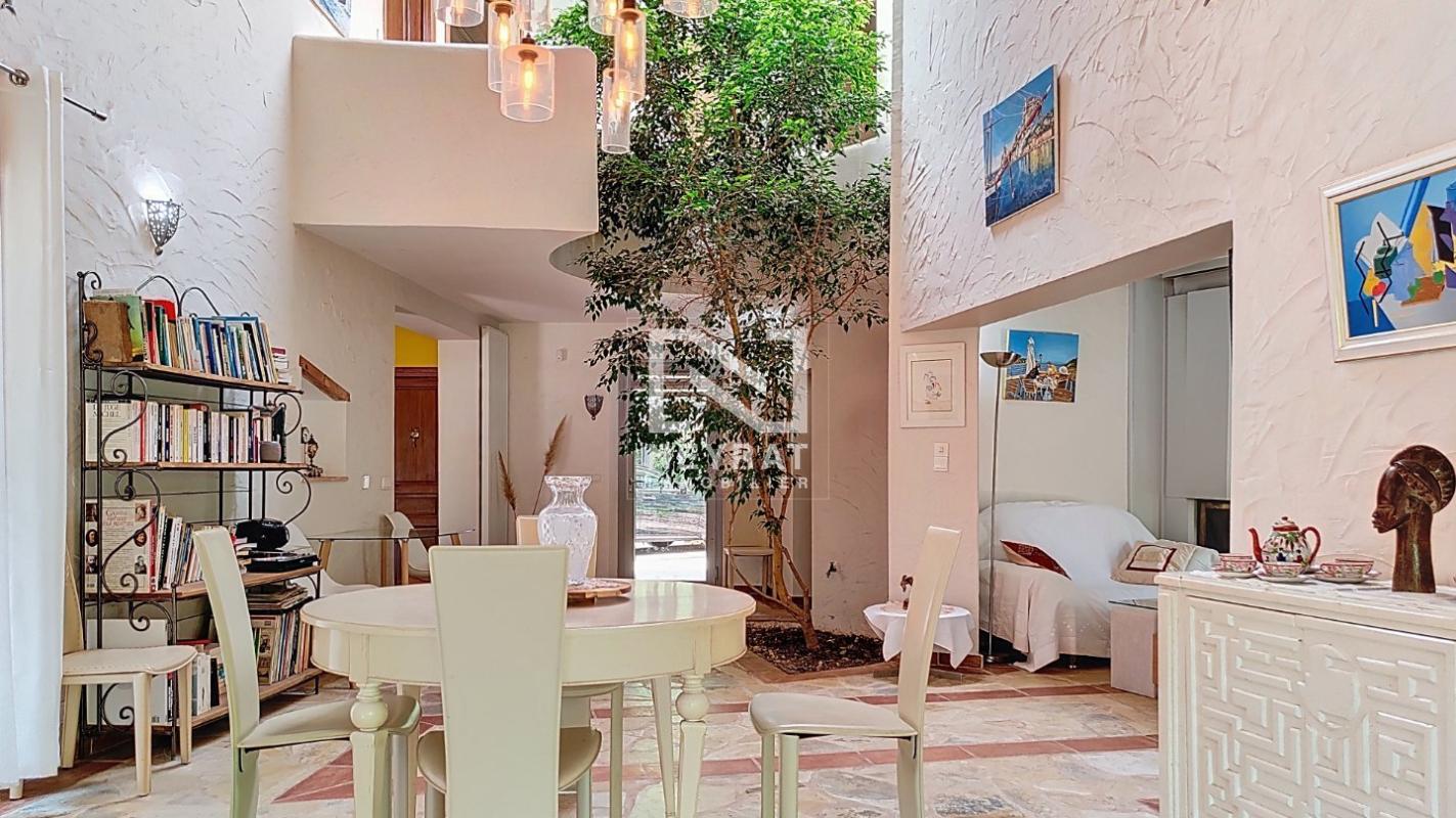 Cette maison atypique offre un intérieur chaleureux et lumineux grâce à son vaste salon-séjour baigné de lumière naturelle par un puits de lumière, où se distingue un arbre majestueux planté au coeur même de la pièce, apportant une touche unique et un esprit nature à l'ensemble.