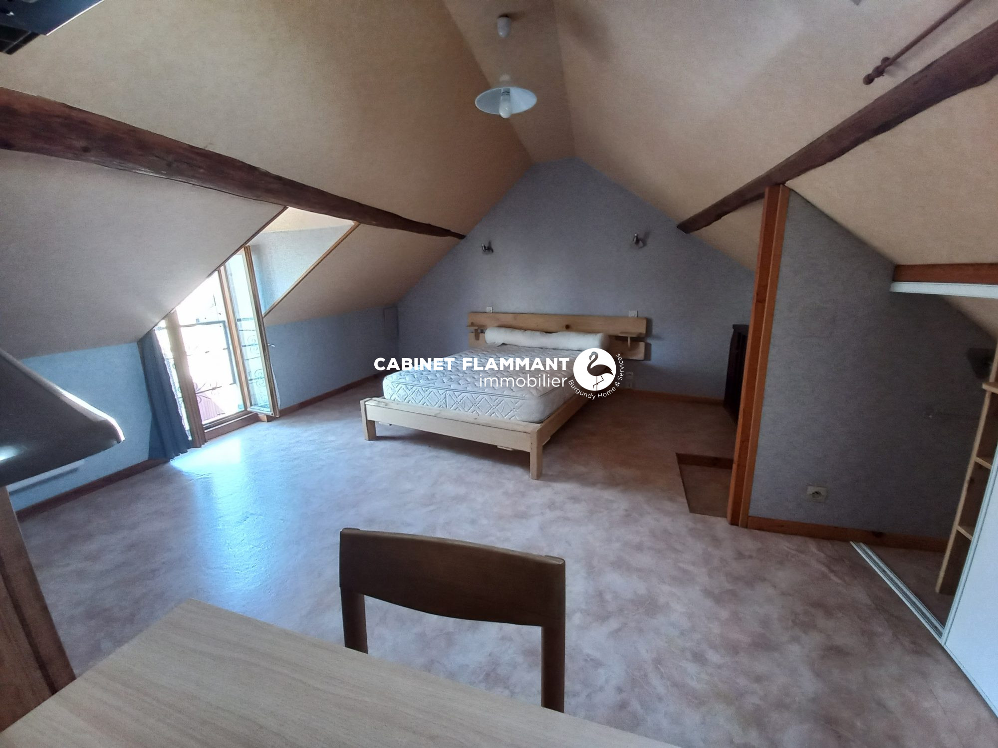 -Au deuxième étage: une grande chambre lumineuse avec rangement et sol en parquet.
