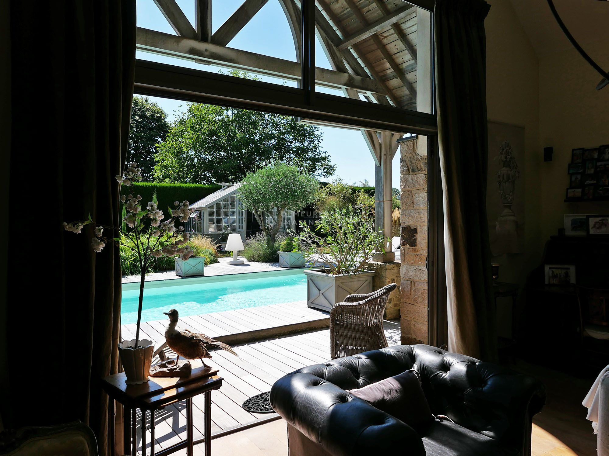 Le jardin, en parfaite harmonie avec la maison, abrite une serre où l'on imagine aisément s'installer pour lire, rêver ou contempler le paysage, en toute saison. Un potager, un jardin d'hiver soigneusement décoré, et une vaste terrasse en bois ceinturant la piscine composent un univers riche en atmosphères. Chaque espace invite au repos, à la contemplation, à la reconnexion.