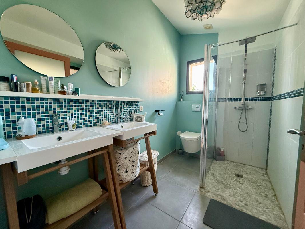 Elle se compose d'un vaste séjour baigné de lumière, agrémenté d'une cheminée qui crée une ambiance chaleureuse tout au long de l'année. Côté nuit, quatre chambres confortables et un bureau offrent de multiples possibilités d'aménagement pour toute la famille. Deux salles d'eau viennent compléter l'ensemble, alliant confort et fonctionnalité.