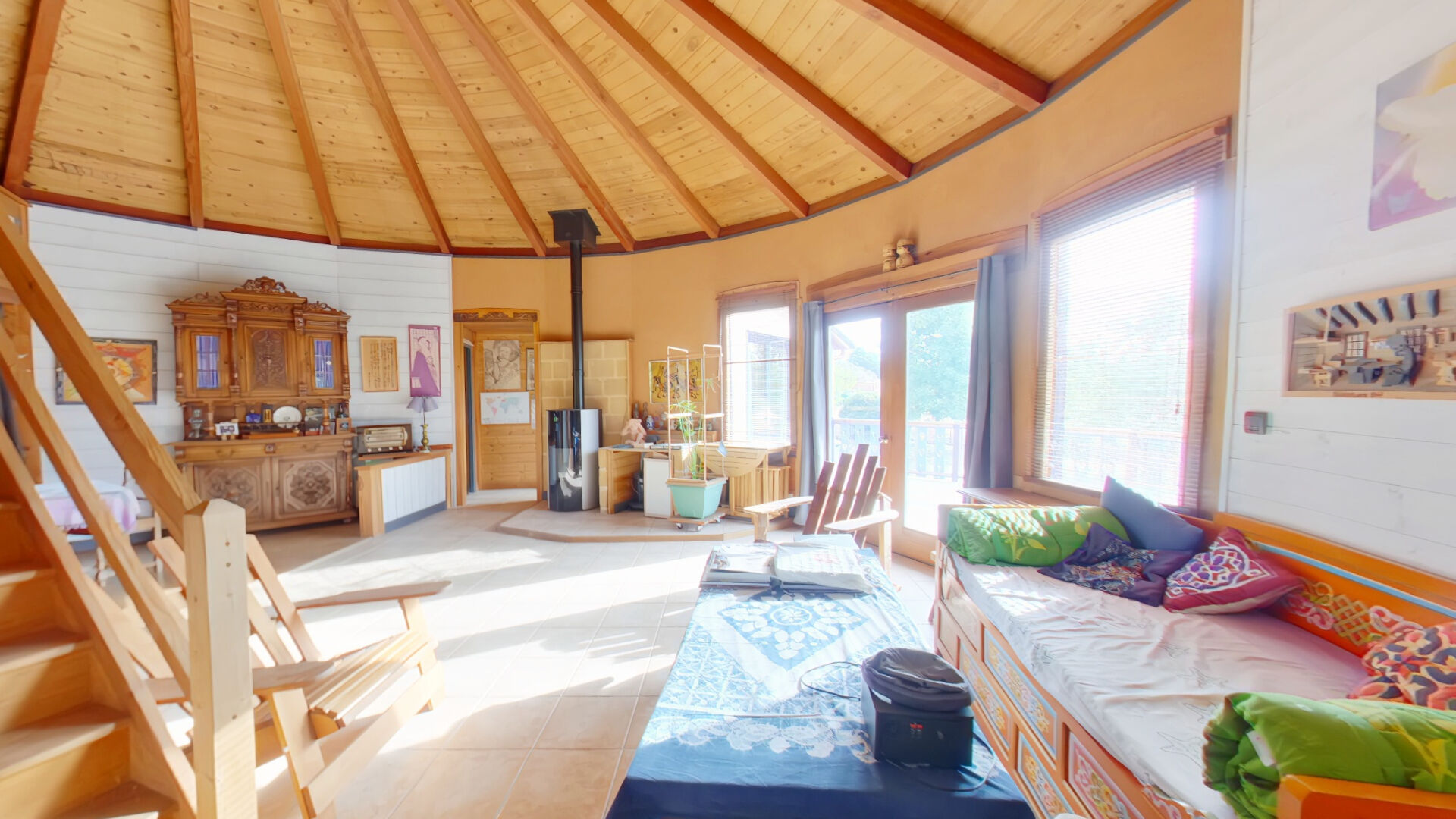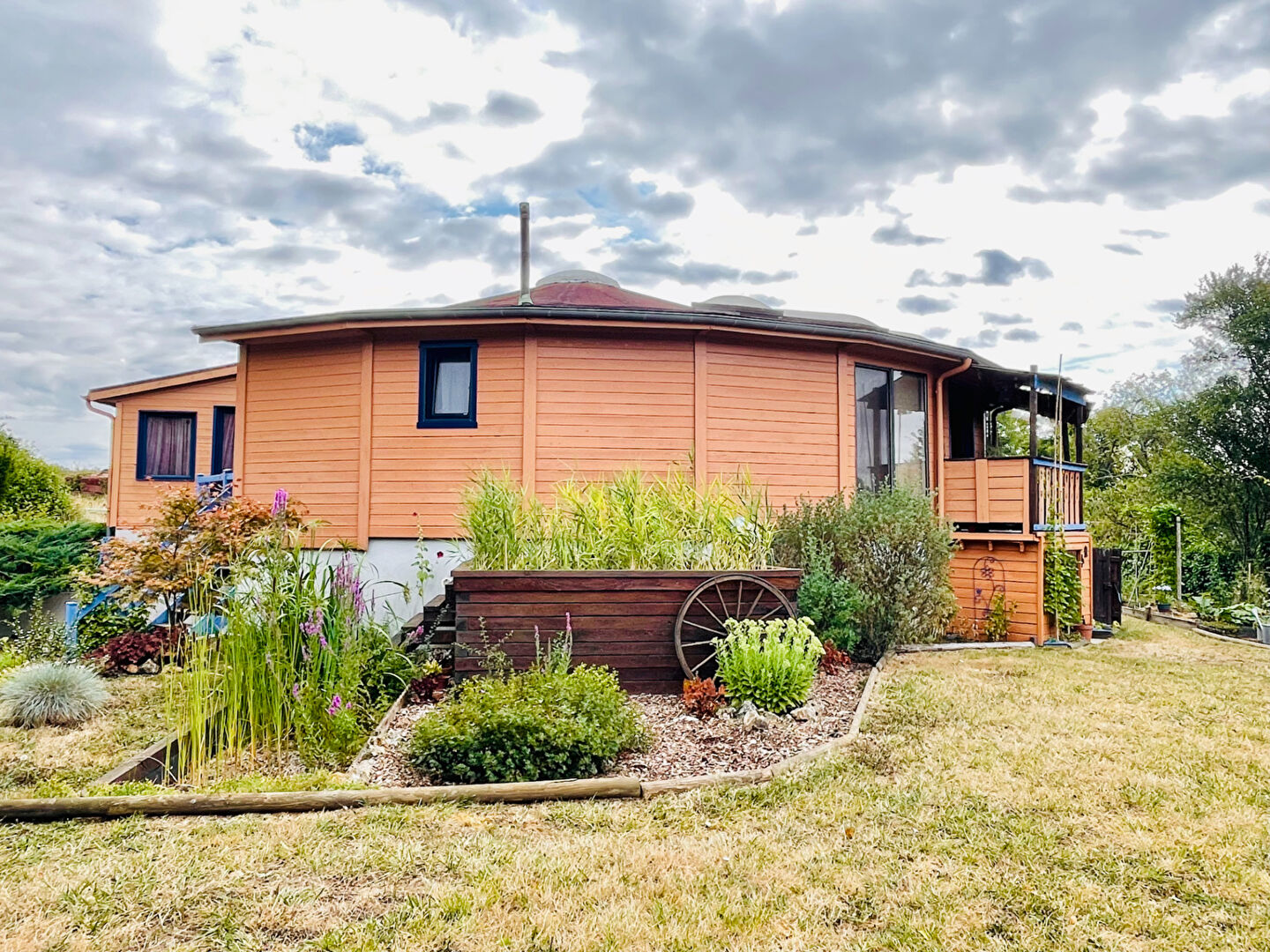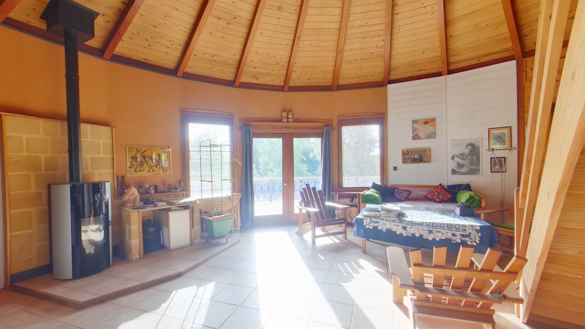 Gérald vous propose, exportée de l'Oregon et construite en 1999, cette maison au charme singulier qui vous séduira par son architecture ronde et son ossature en cèdre rouge, posée sur sous-sol.