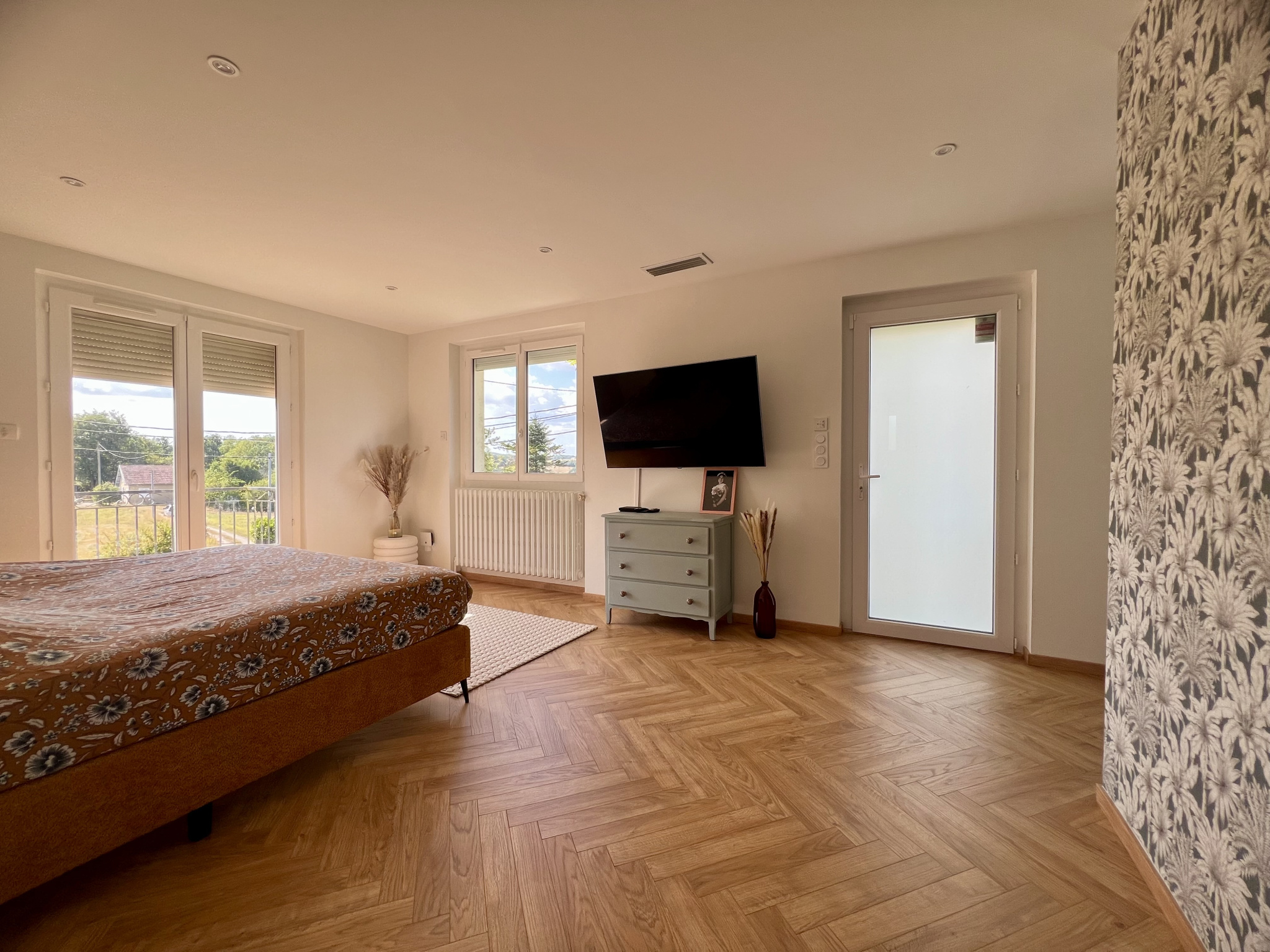 À l'étage, l'espace nuit se compose d'une grande suite parentale baignée de lumière avec dressing et salle d'eau, de deux autres chambres, d'une salle de bain et d'un second toilette.