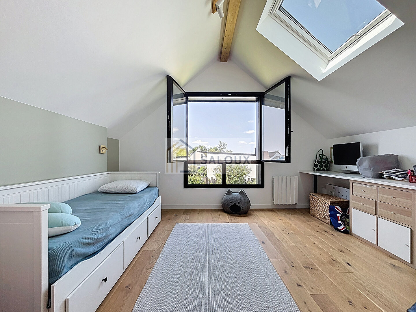 À l'étage, en plus des quatre chambres spacieuses, vous profiterez d'une magnifique extension comprenant une bibliothèque et deux espaces bureaux, parfaits pour le télétravail, la lecture ou les loisirs.