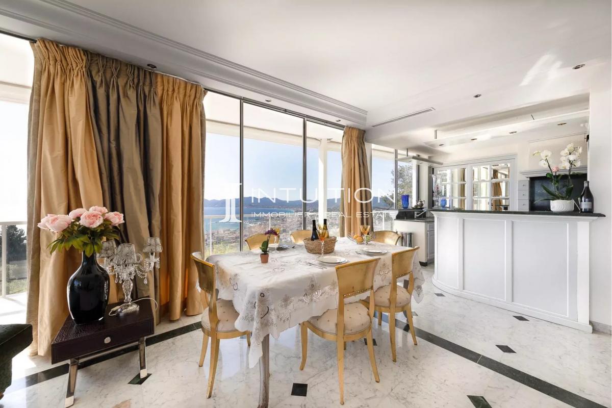 Edifiée sur plusieurs niveaux desservis par un ascenseur, cette agréable maison d'architecte dispose d'un vaste séjour avec cuisine semi-ouverte et une exposition Sud Sud-ouest avec vue imprenable sur la mer, quatre chambres dont trois en suite, un petit salon avec cuisine d'été, et un toit terrasse permettant un panorama sur la ville de Cannes.
