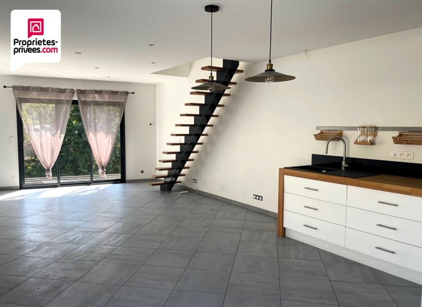 L'habitation comprend : une entrée distribuant des WC et un débarras, un grand et lumineux salon-salle à manger avec cuisine américaine A/E et accès terrasse. A l'étage, depuis le palier, vous trouverez deux chambres mansardées dont une avec dressing et une salle de douches avec WC.