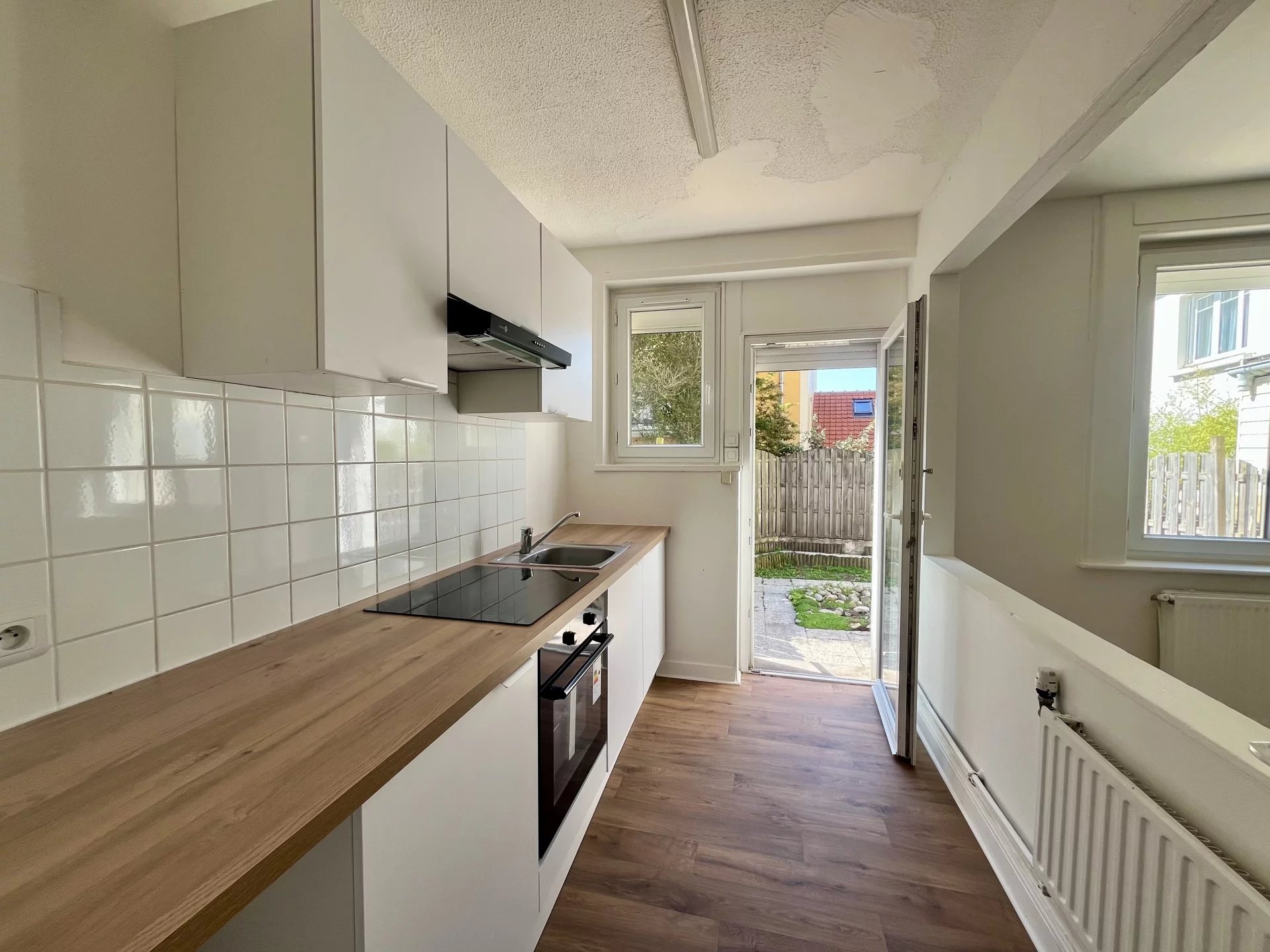 Au rez-de-chaussée, une jolie pièce de vie lumineuse avec une cuisine fonctionnelle donnant accès direct à une cour idéale pour les repas en extérieur ou la détente ou soleil.