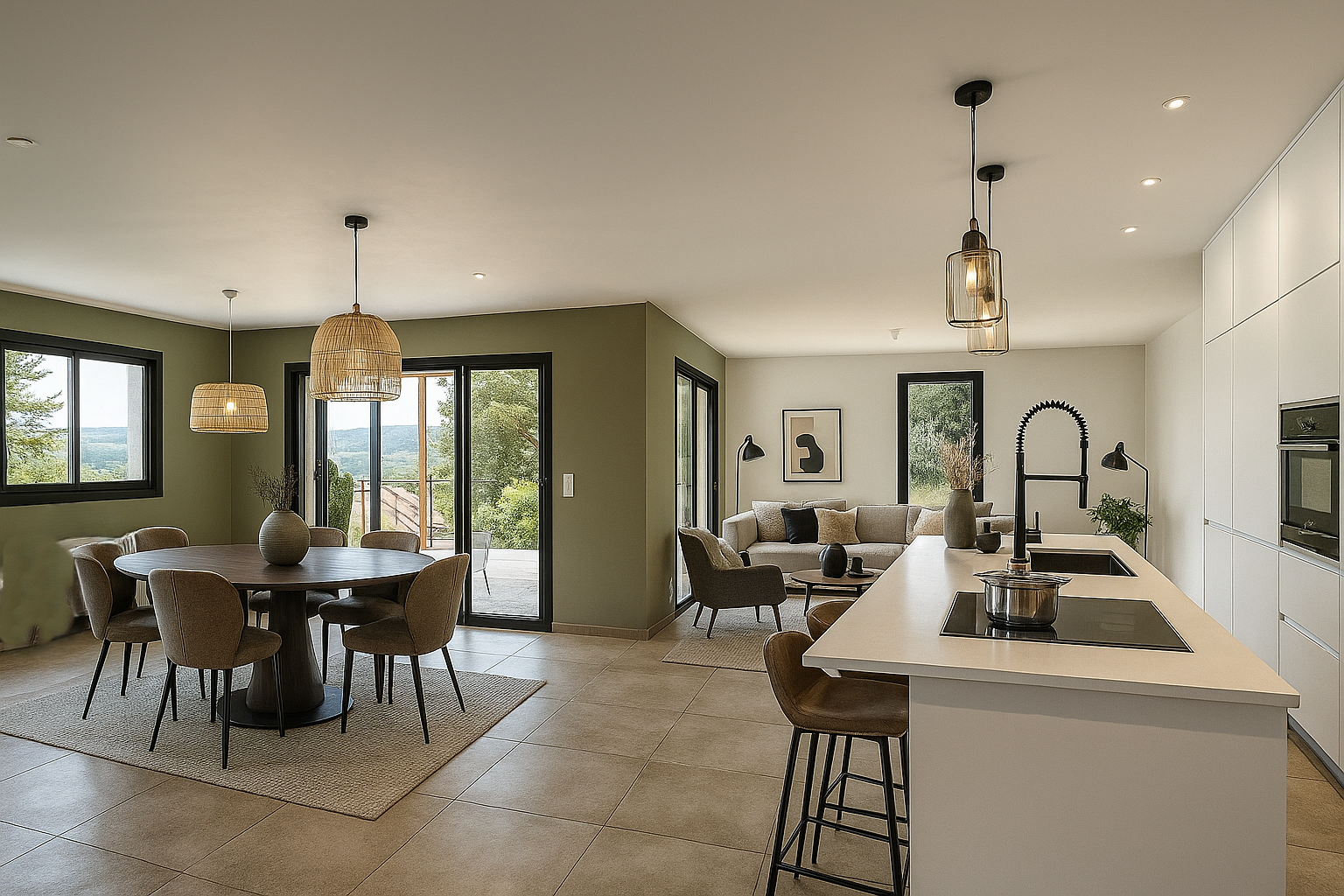 La maison s'ouvre sur une belle pièce de vie lumineuse d'environ 50 m2, avec accès direct à la terrasse et à une vue dégagée. La cuisine, à aménager selon vos envies, s'intègre parfaitement à cet espace convivial tourné vers l'extérieur.