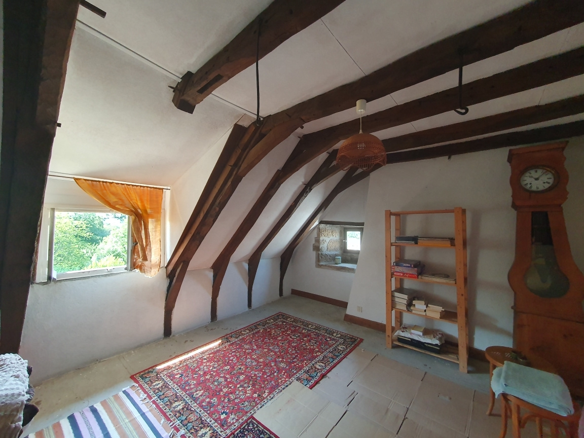 Un séjour avec point d'eau et une cheminée en pierre magistrale de beauté, 3 chambres en RDC, une salle de bains et wc séparé; A l'étage, 2 grandes chambres mansardées aménagées dans les combles, un grenier.