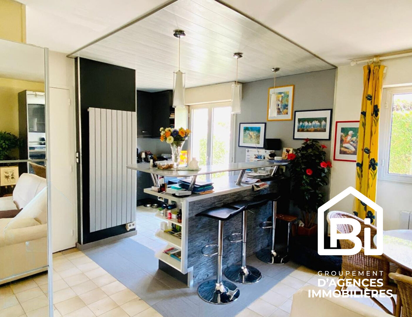 - Un salon séjour avec poêle à granulés ouvert sur une cuisine aménagée et équipée