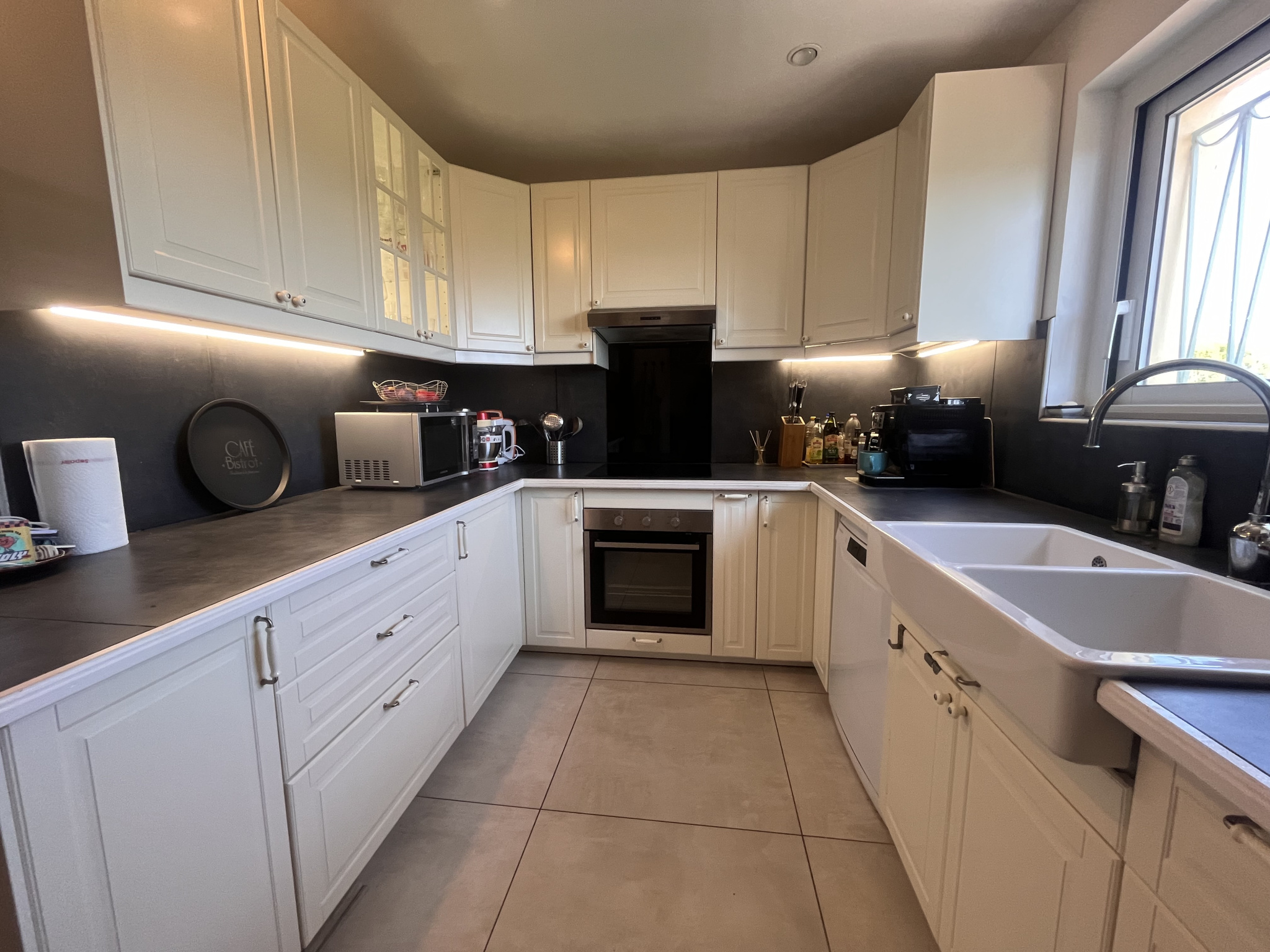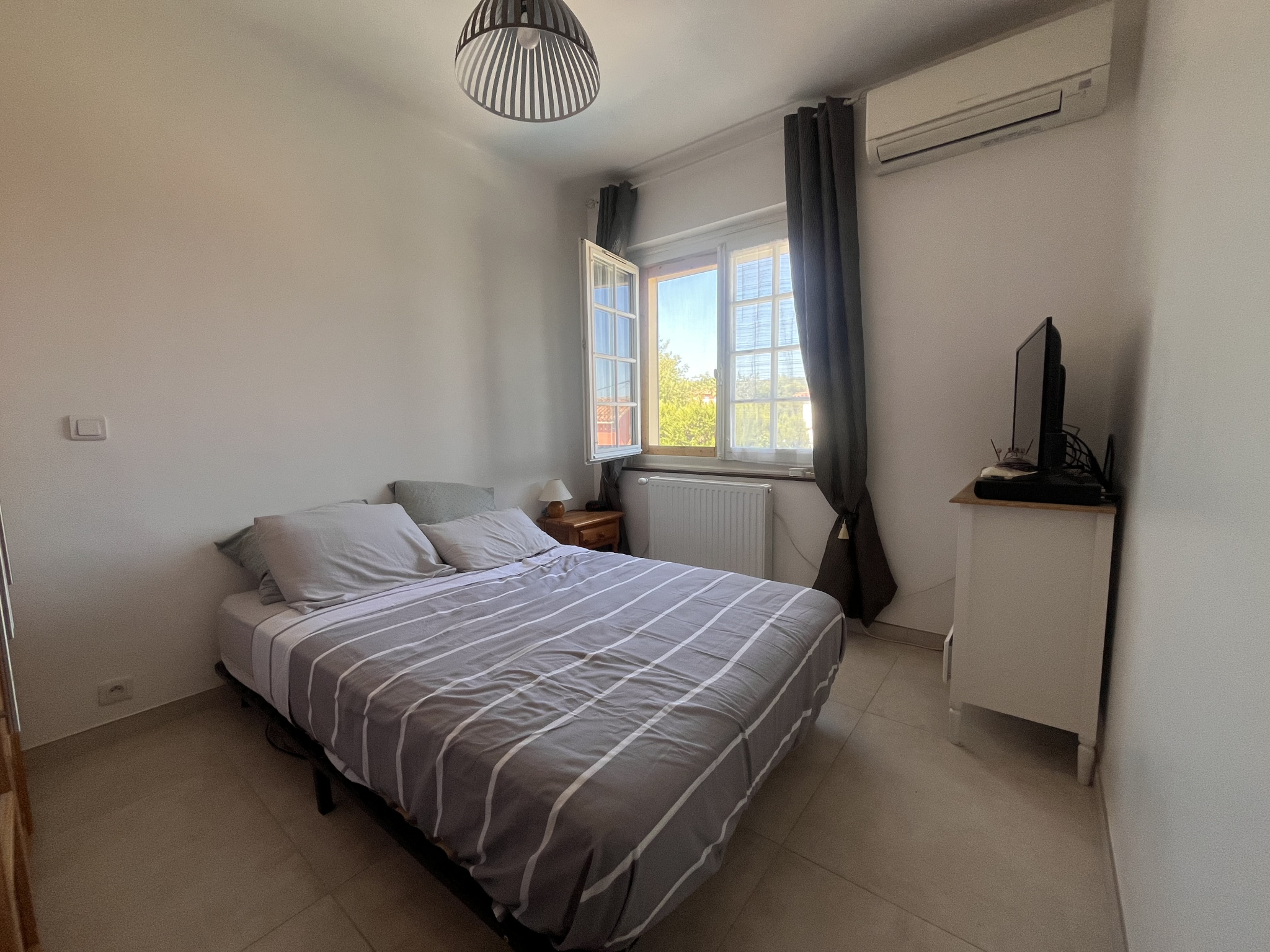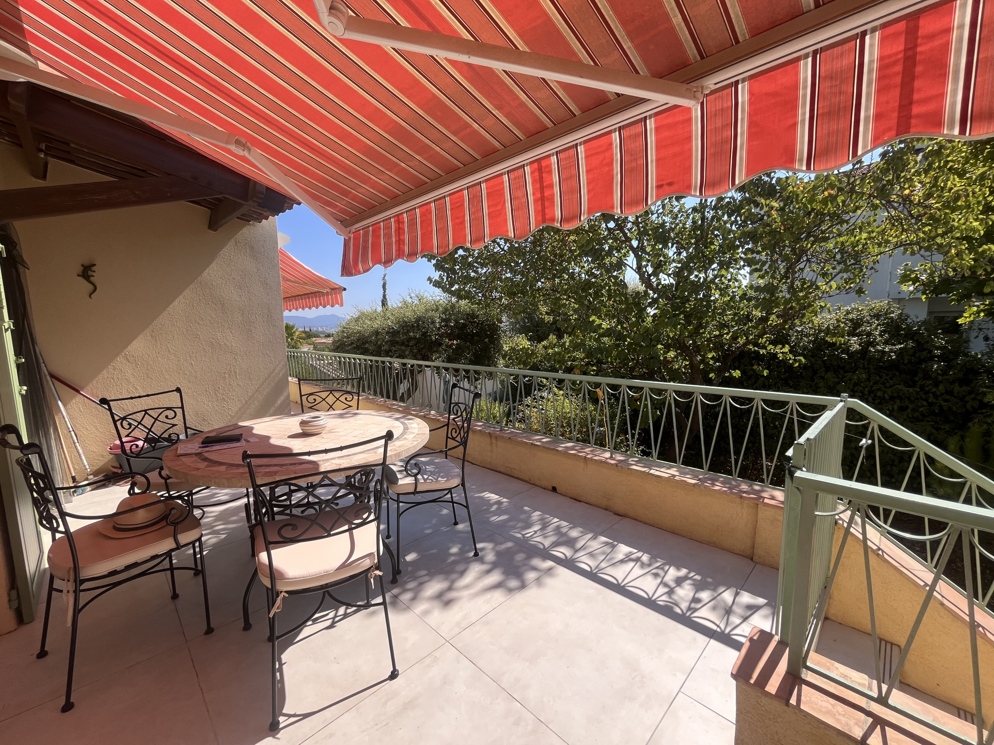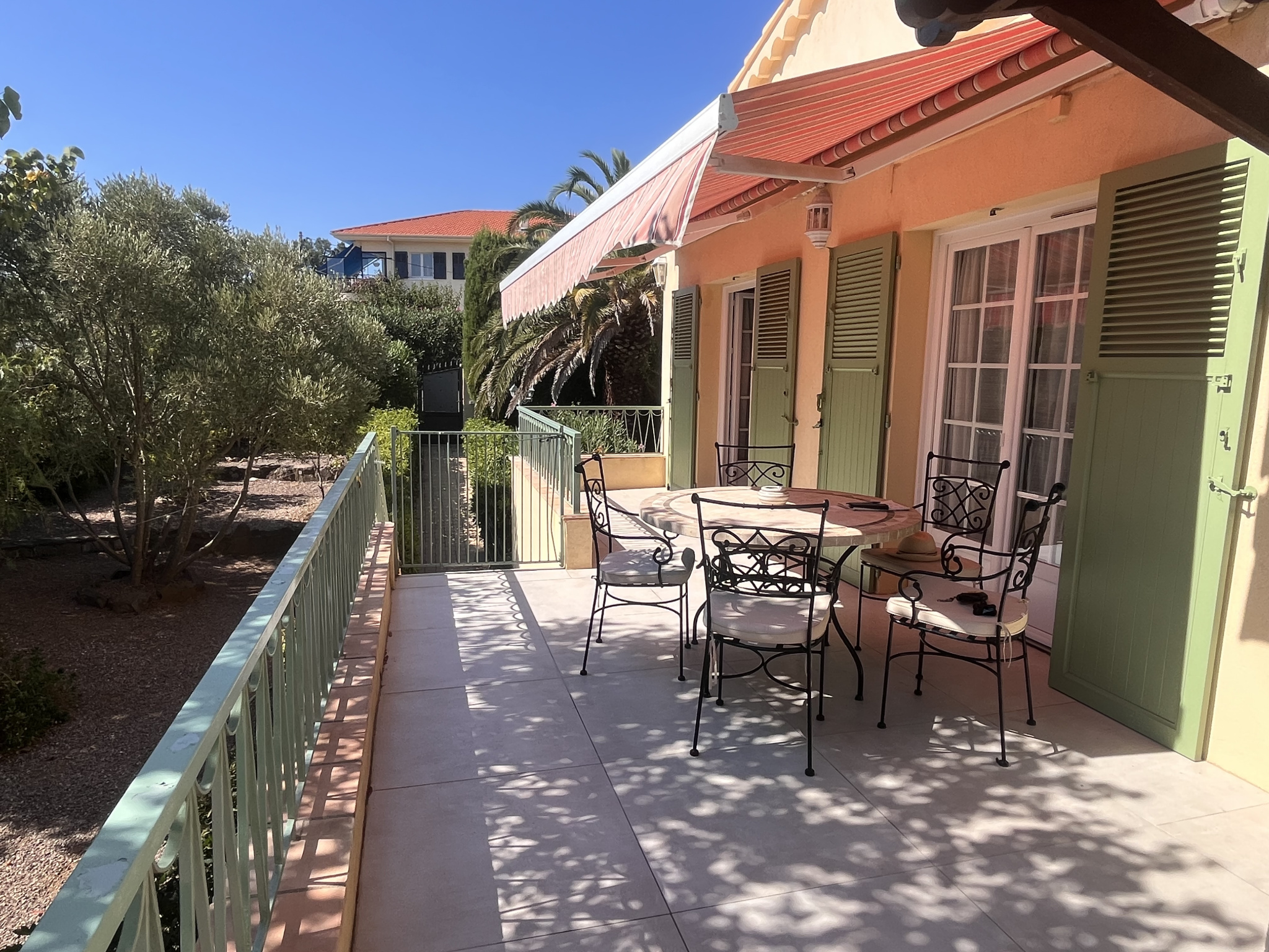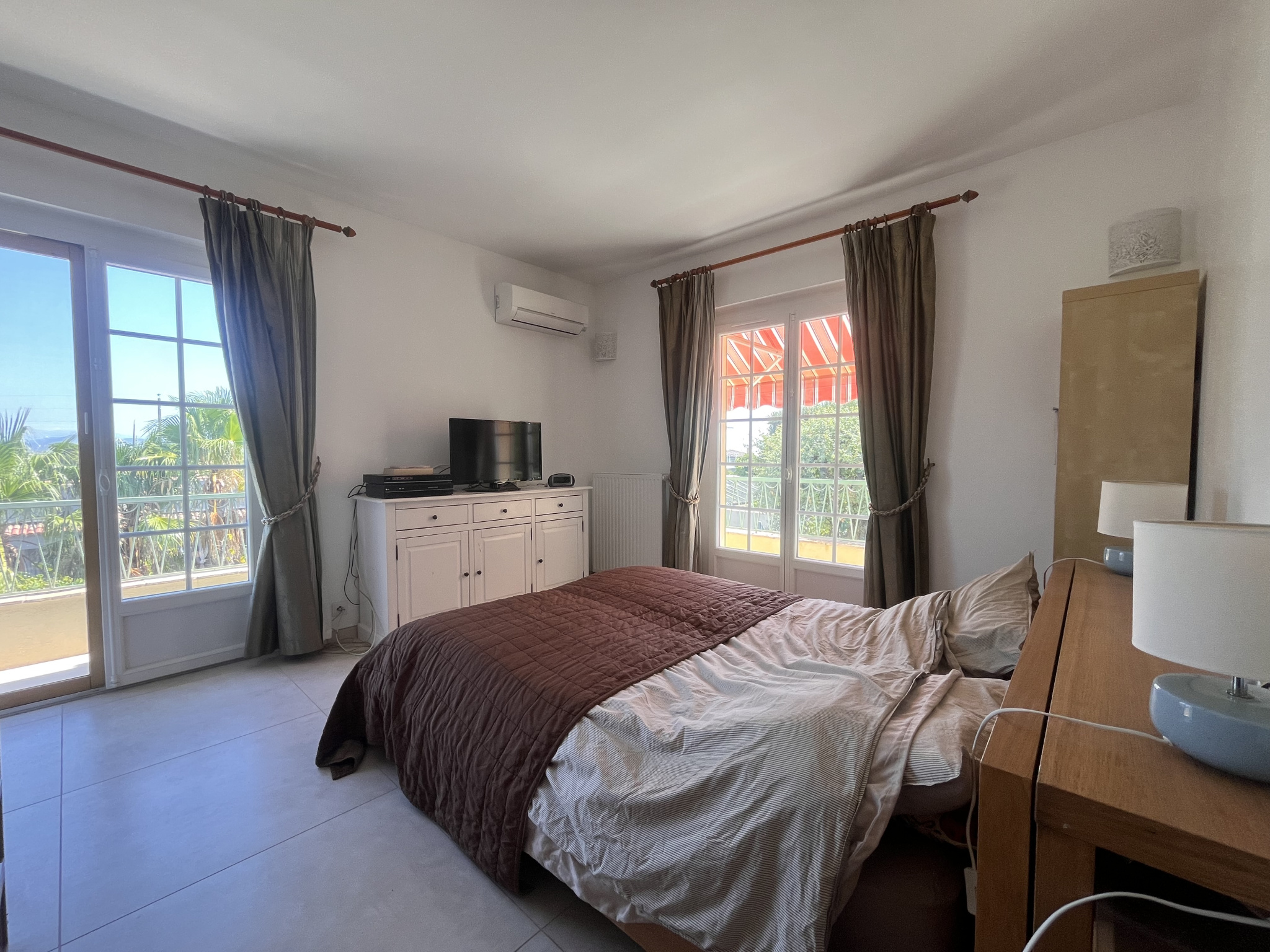 Maison individuelle des années 60 se composant en 2 appartements totalisant environ 155m2 de surface habitable. A l'étage : entrée avec placards, salon/salle à manger avec insert et accès à une terrasse avec vue mer, cuisine séparée, 2 chambres, une salle d'eau, toilettes séparées. En rez de jardin : salon, cuisine séparée, 2 chambres, une salle d'eau, toilettes séparées. Garage de 25m2. Double vitrage, climatisation, chauffage au gaz, volets en aluminium. Piscine au sel, terrain de boules, parkings, portail automatique, visiophone, ravalement de façade fait.