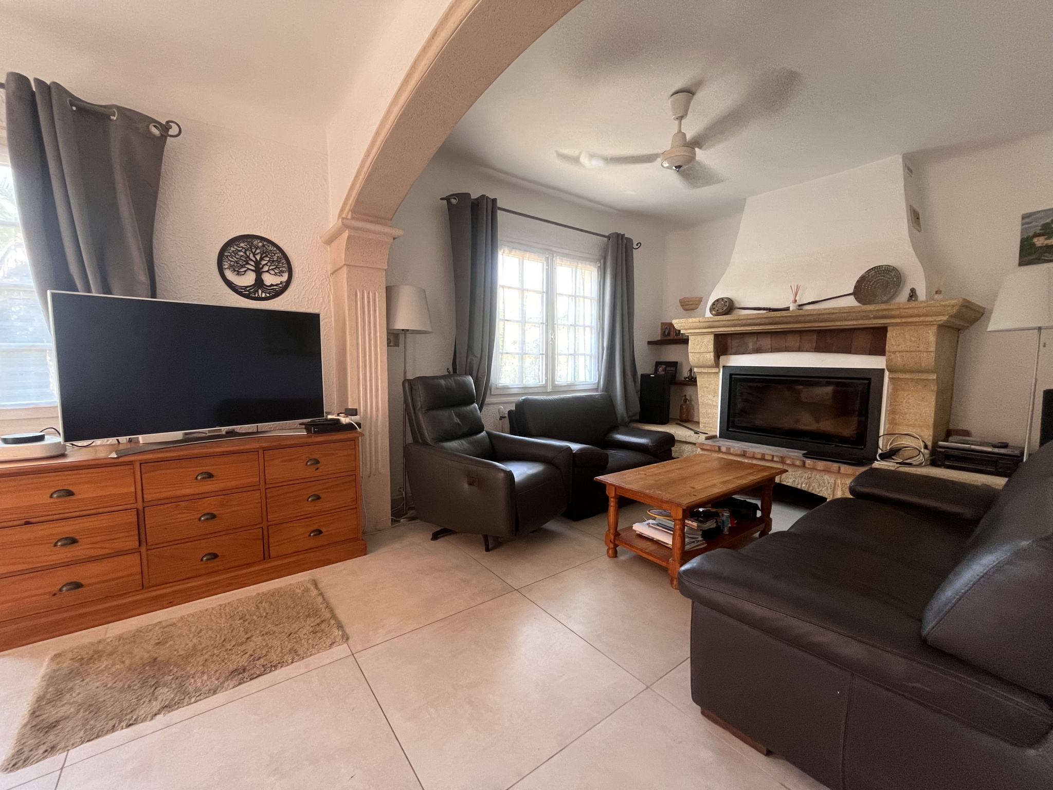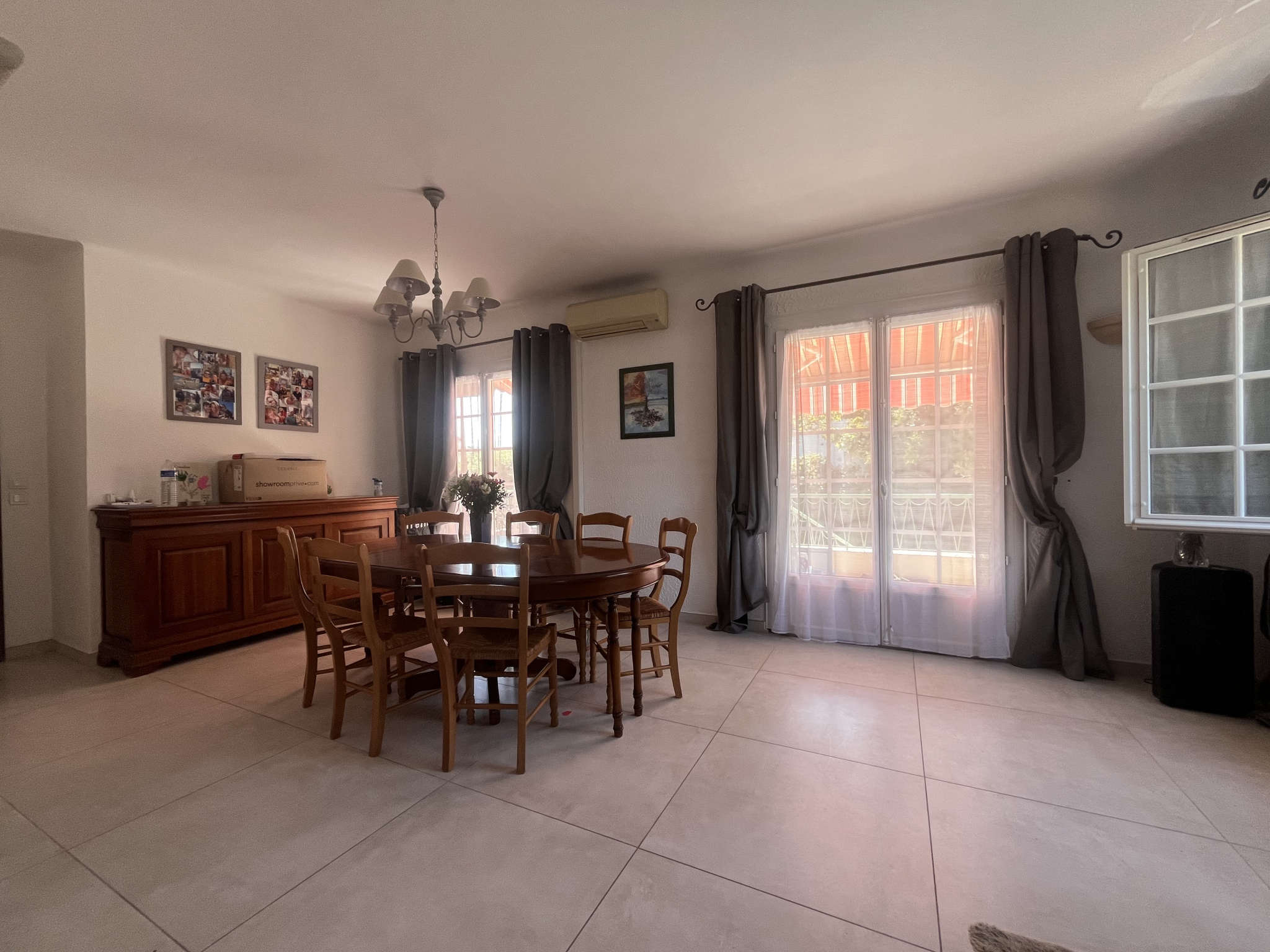 Maison individuelle des années 60 se composant en 2 appartements totalisant environ 155m2 de surface habitable. A l'étage : entrée avec placards, salon/salle à manger avec insert et accès à une terrasse avec vue mer, cuisine séparée, 2 chambres, une salle d'eau, toilettes séparées. En rez de jardin : salon, cuisine séparée, 2 chambres, une salle d'eau, toilettes séparées. Garage de 25m2. Double vitrage, climatisation, chauffage au gaz, volets en aluminium. Piscine au sel, terrain de boules, parkings, portail automatique, visiophone, ravalement de façade fait. Terrain plat de 978m2.
