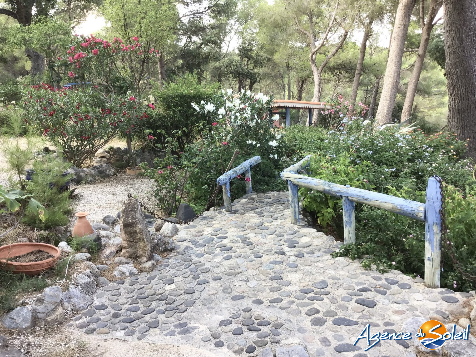 Le jardin paysagé et arboré dispose d'un forage avec son arrosage au goutte à goutte