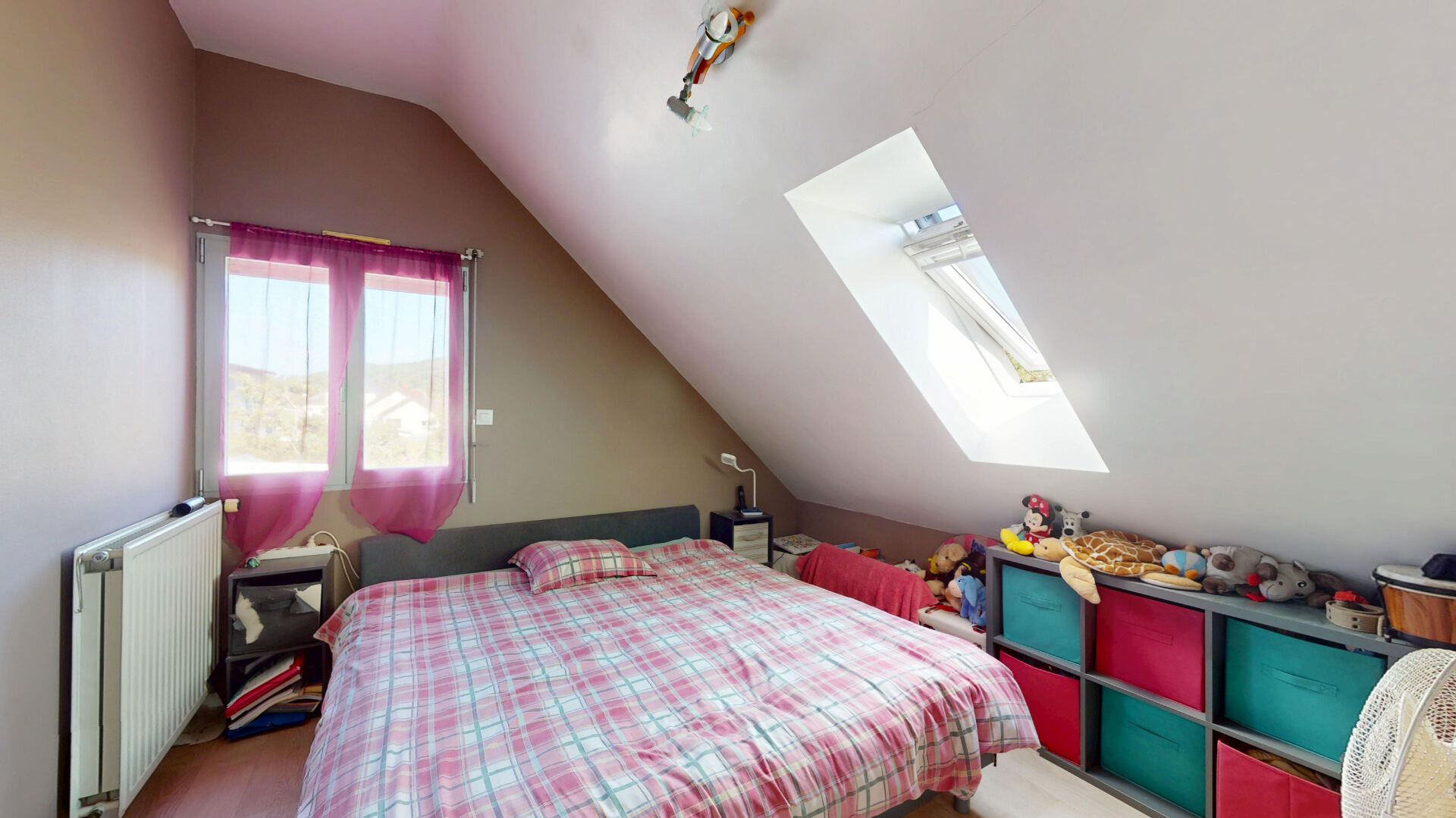 À l'étage, une mezzanine surplombe le séjour et dessert trois chambres. Vous y trouverez également une salle de bain fonctionnelle, équipée à la fois d'une baignoire, d'une douche et d'un WC.