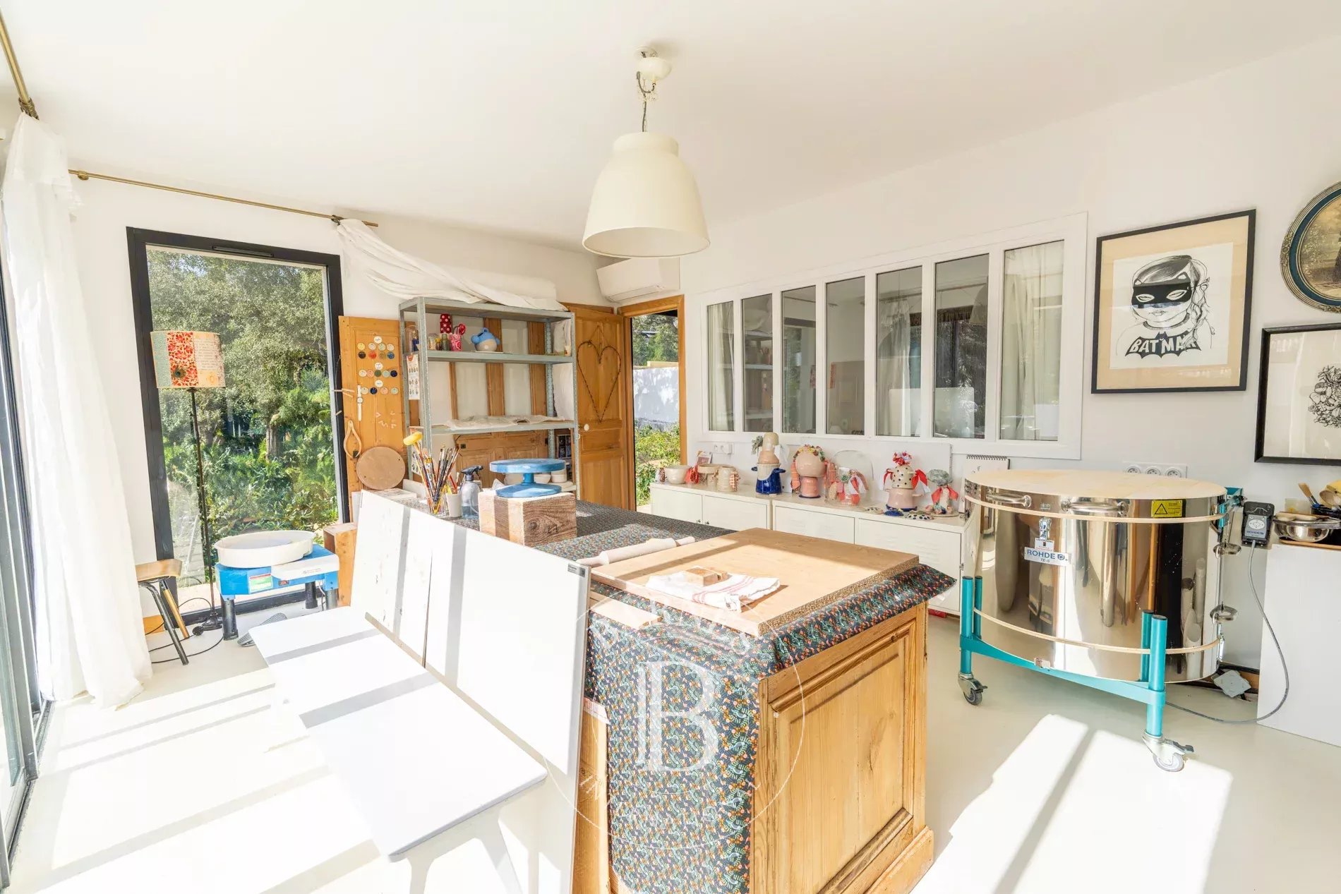 La pièce de vie, avec cheminée, salle à manger et cuisine ouverte équipée, s’ouvre sur une large terrasse baignée de soleil.