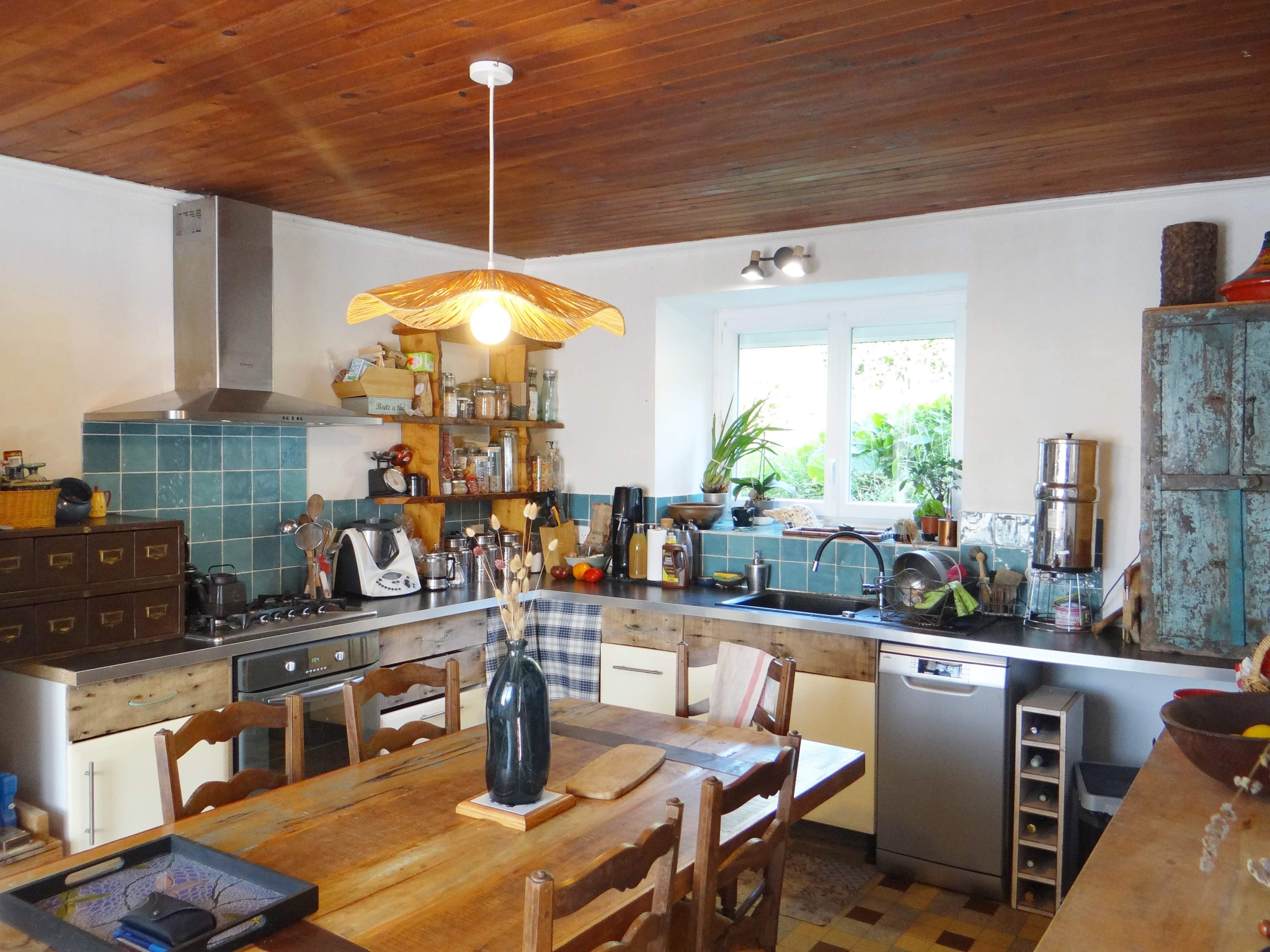 Au rez-de-chaussée, grand séjour de 32 m2 équipé d'un poêle de masse et d'un poêle à bois, cuisine indépendante aménagée ; chaufferie-cellier, chaudière à bois, douche retour de plage.