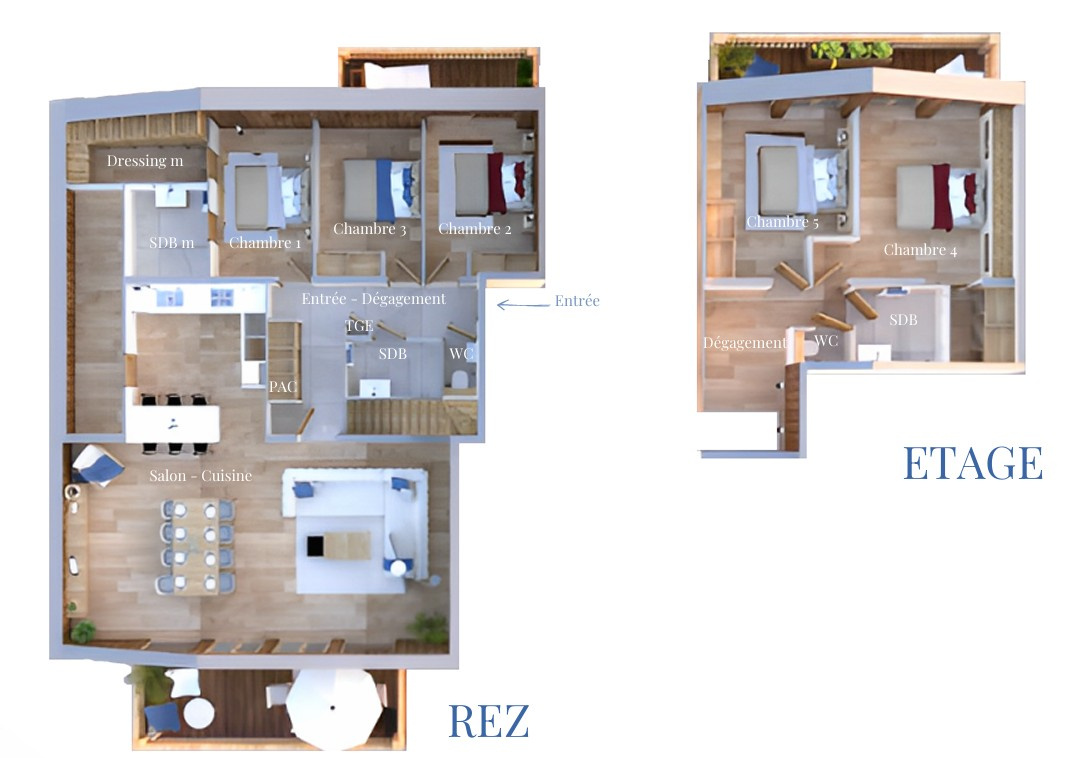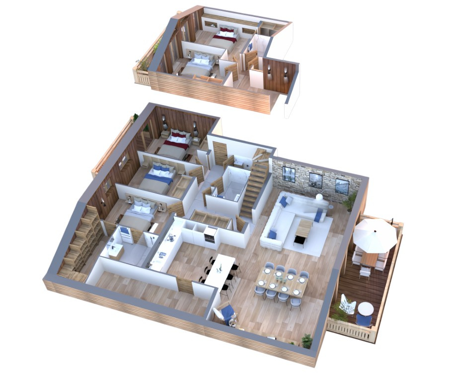 Le Mélèze Doré est un duplex de 191 m2 dont 150 m2 habitable, possèdant 3 balcons-terrasses, 5 chambres et un salon avec cuisine américaine d'une surface de 80 m2 ! Vous l'aurez compris, cet appartement offre un confort d'exception. Vous vous sentirez comme dans un chalet !