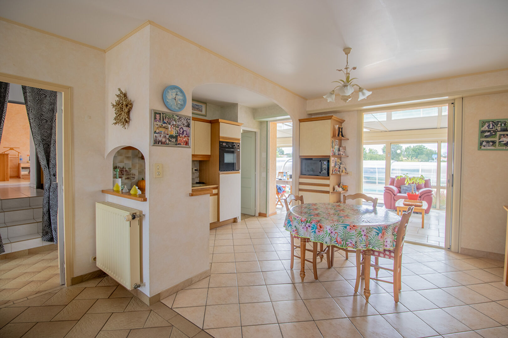 Elle se compose d'une entrée, d'une belle pièce de vie avec cuisine équipée, cellier, salle à manger ouverte sur une véranda lumineuse de 26 m².