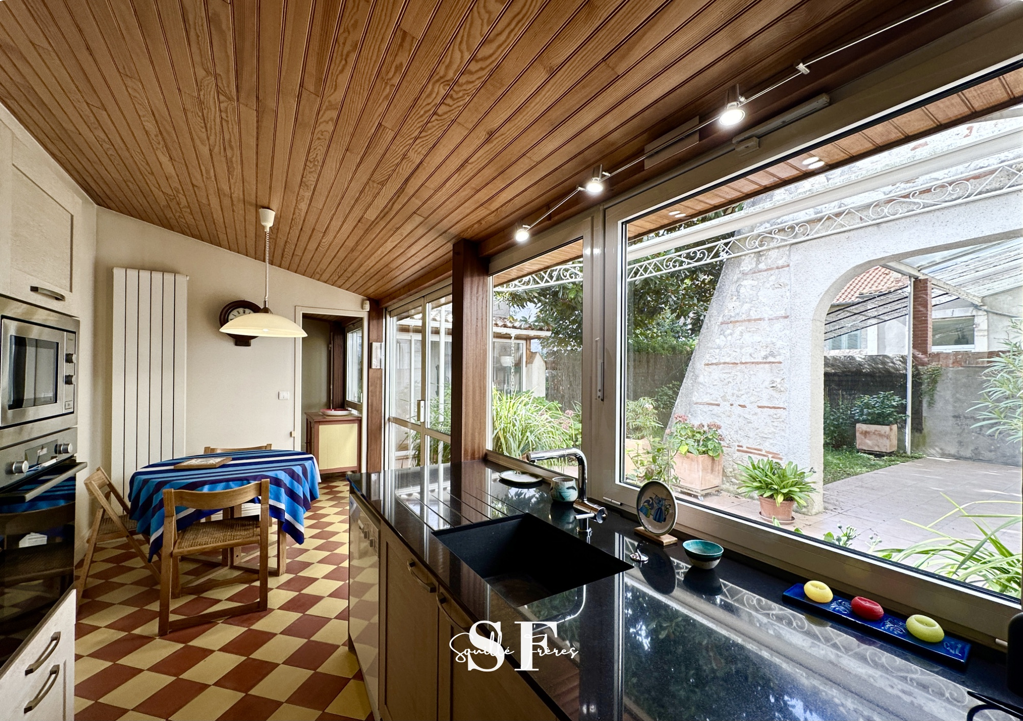En rez-de-chaussée l'entrée dessert un salon/salle à manger de plus de 55 m2, une cuisine avec arrière-cuisine et buanderie. Le tout donnant accès direct sur le jardin arboré et sans vis à vis de 60m2 environ.