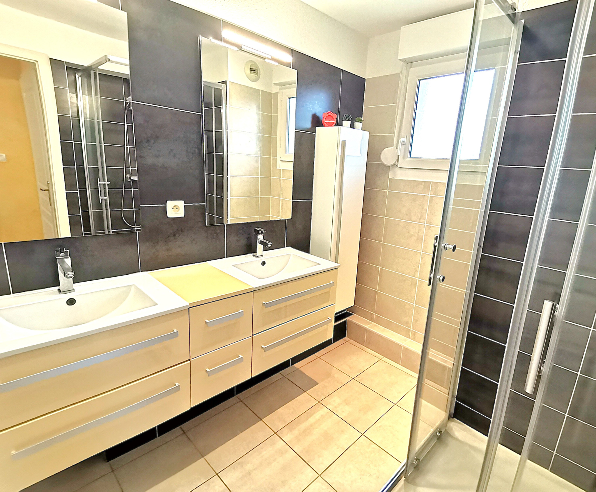 Aménagé avec goût et très bien agencé, vous y trouverez : une entrée avec dégagement et armoires murales intégrées, un vaste salon/séjour avec accès à la terrasse de 10 m2 (Ouest), une cuisine équipée séparée, une chambre, une salle d'eau (avec double vasque) et un WC séparé.