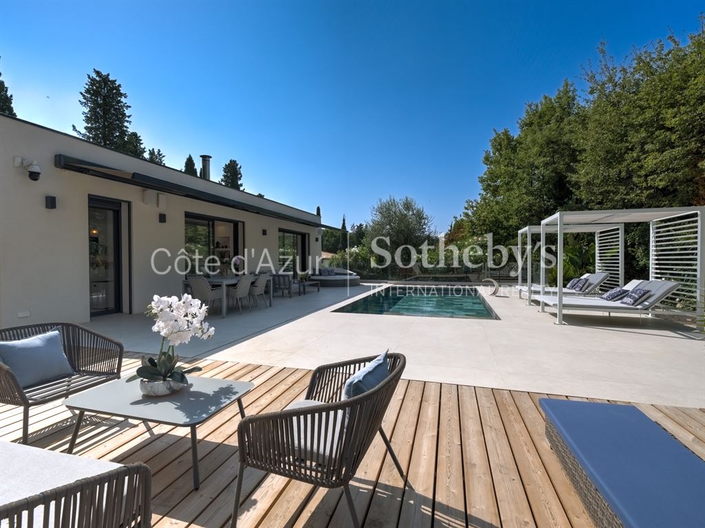 À seulement trois kilomètres de Valbonne, à proximité de la Mougins School, de la Mouratoglou Academy et du Centre International de Valbonne, et en bordure d’un prestigieux golf, cette villa contemporaine de 241 m² sur un terrain de plus de 1 000 m² offre calme et intimité.