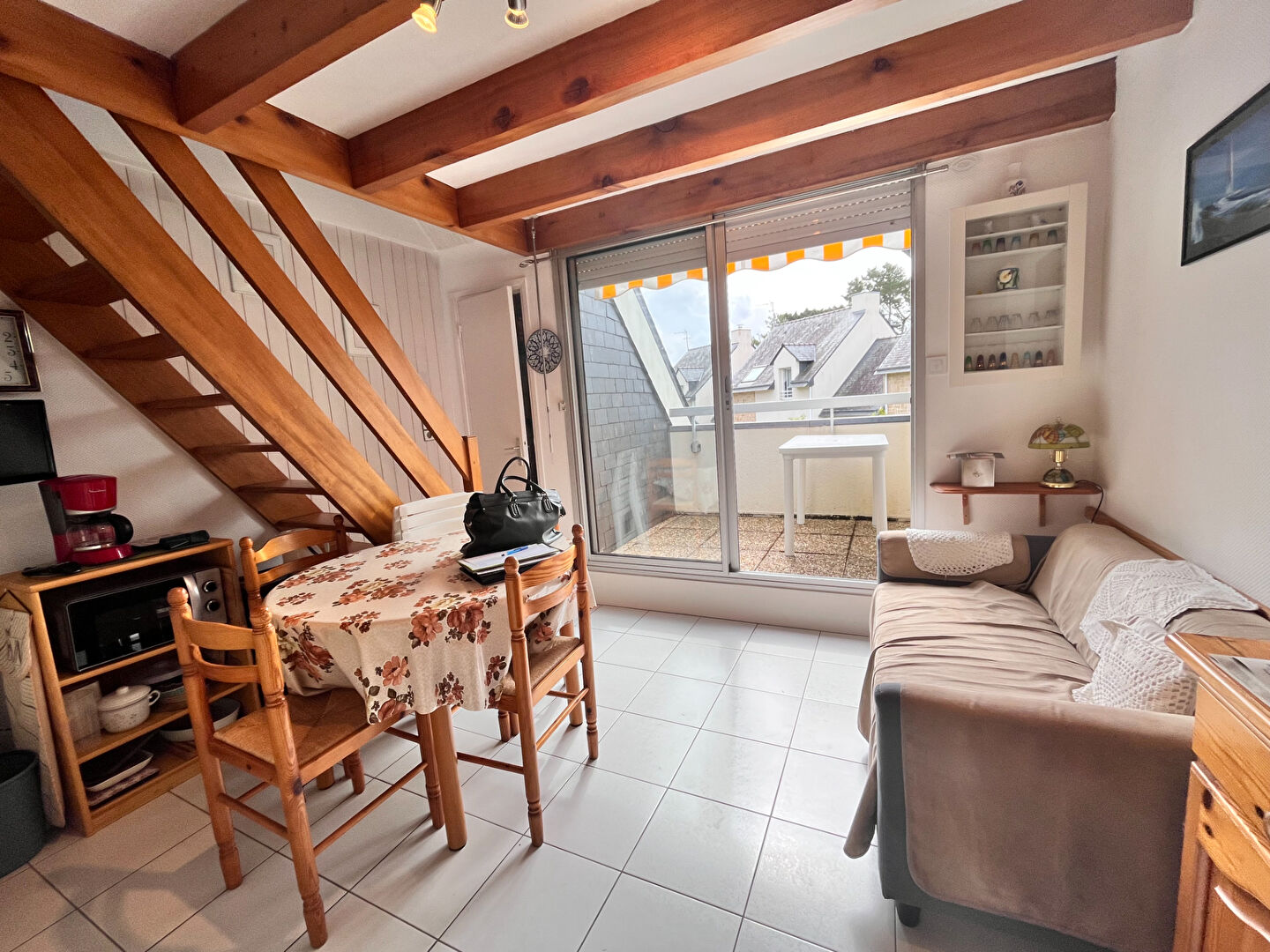 SQUARE HABITAT - CARNAC-PLAGE : Au calme, cet appartement de type T3, d'une superficie de 29 m² habitable, 39 m² au sol, situé au 1er étage comprend une entrée avec placard, un séjour et une kitchenette aménagée et équipée donnant sur une loggia, une salle d'eau avec WC, une chambre . A l'étage une chambre en mezzanine.