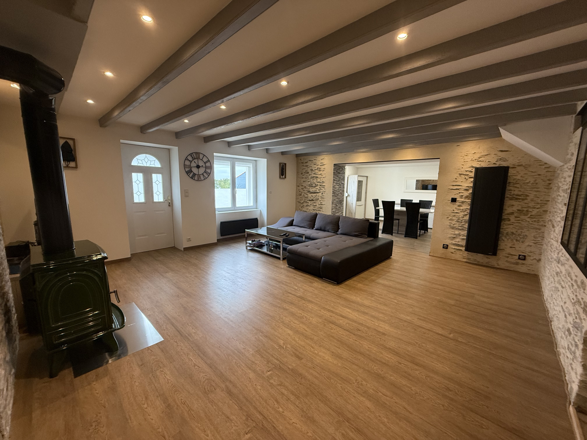 Séjour/salle à manger de 60 m2 avec poêle à bois