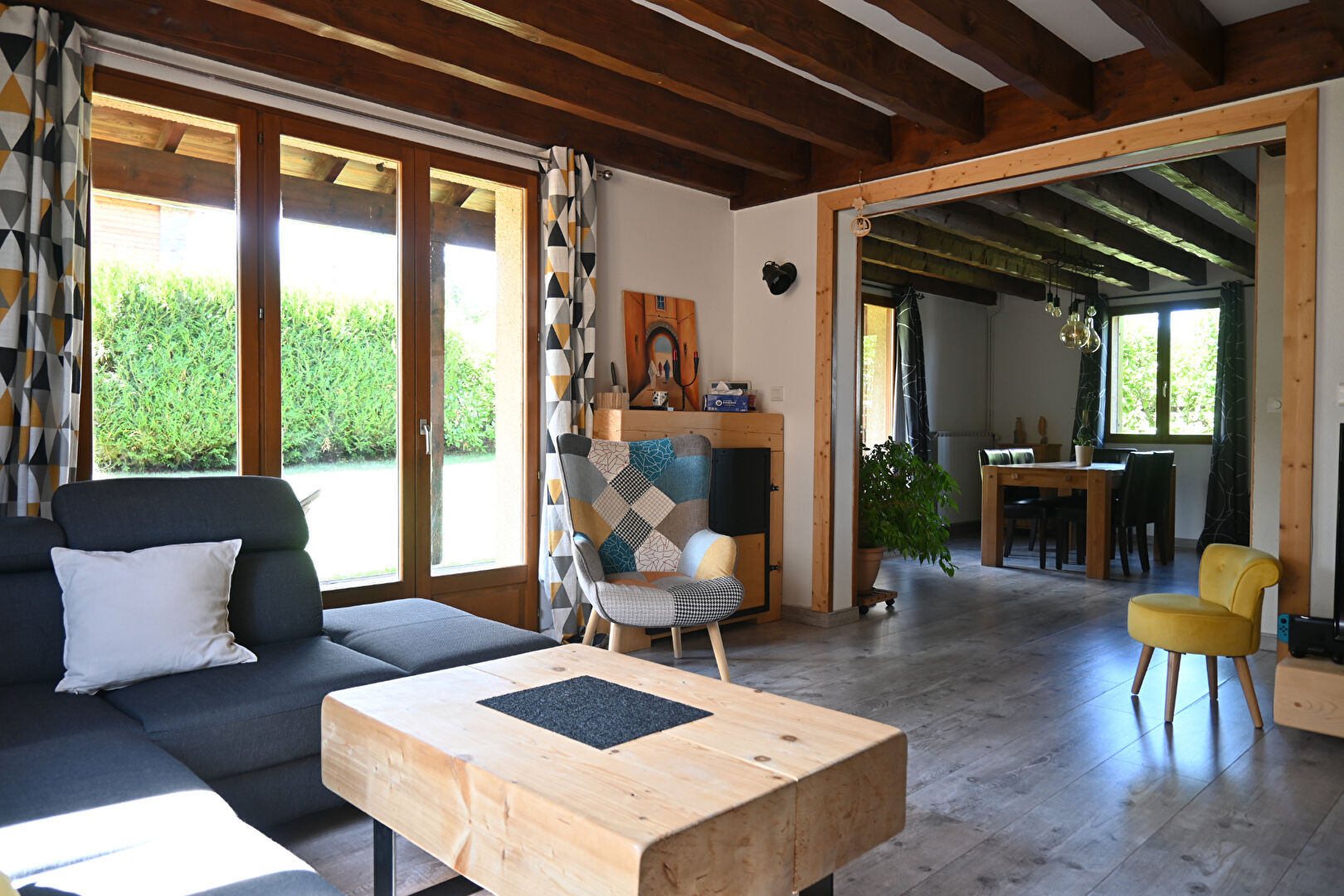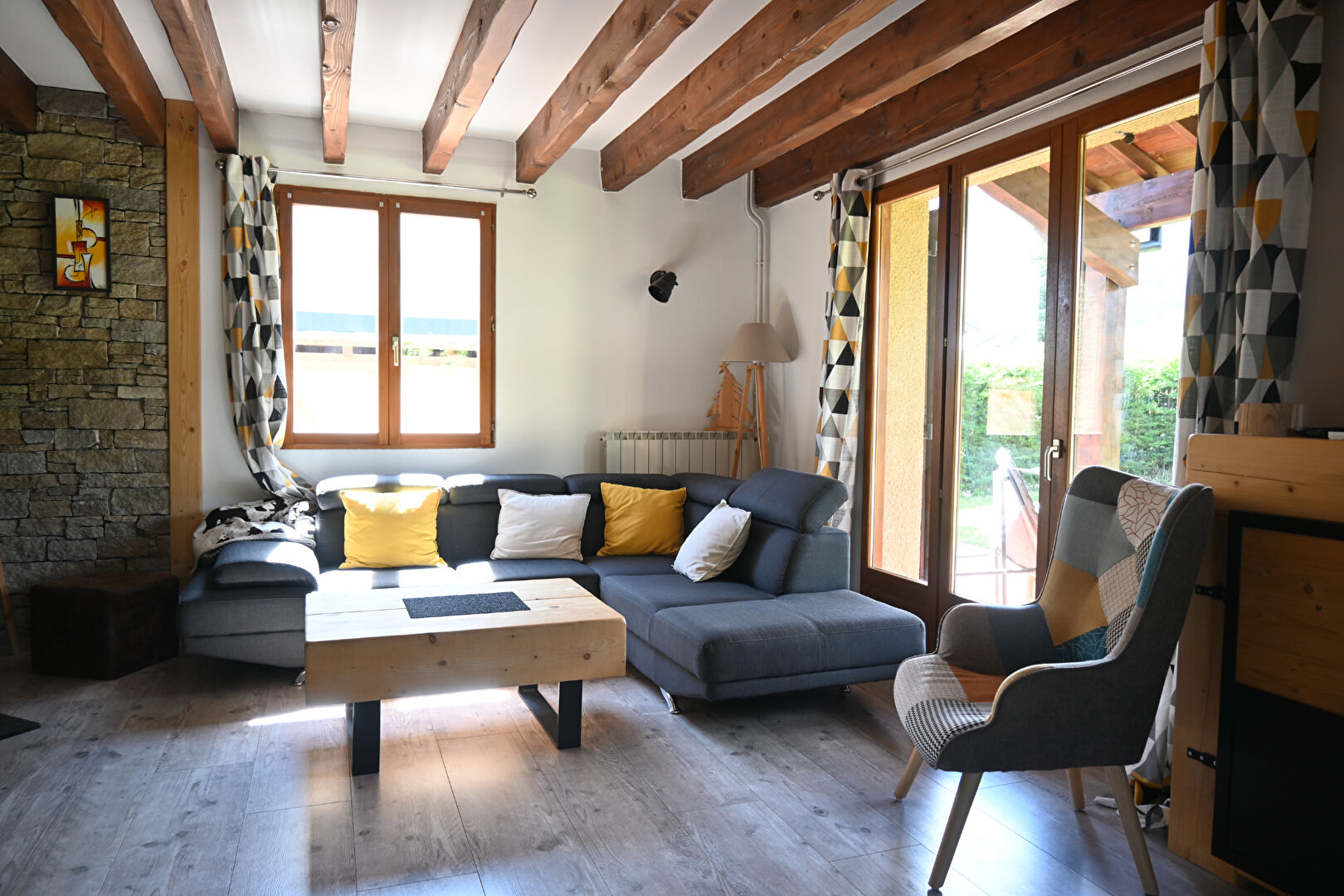En Rez-de-Chaussée : Sas d'entrée - Salon/Séjour bénéficiant d'un poêle à bois ainsi qu'un accès à une terrasse en façade SUD et EST - Cuisine ouverte équipée - Espace buanderie bénéficiant également d'un accès terrasse - Salle d'eau comprenant un WC - 1 chambre.