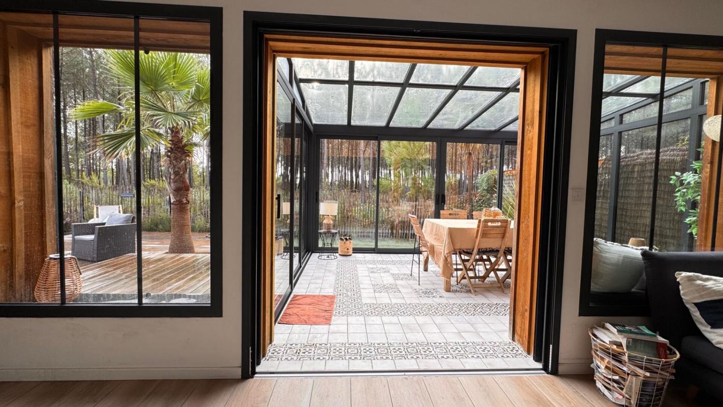 LEGE BOURG Appartement rare avec jacuzzi et 150 m² de jardin privatif face à la forêt ! dans une petite copropriété, entièrement de plain-pied, il vous offre une pièce principale lumineuse avec cuisine ouverte sur salon et une pièce repas dans une véranda chauffée véritable pièce de vie avec vue forêt. 2 chambres avec terrasse côté Est, salle de bains, wc. 45 m² de terrasse bois qui accueille un beau Jacuzzi, chauffage au gaz de ville par le sol, cet appartement n'a rien de commun, c'est un véritable joyau ! Le jardin privatif de 150 m² fait oublier qu'il s'agit d'un appartement et non d'une maison. Vous bénéficierez aussi de 2 places de parking privées. Vous n'osiez en rêver pensant qu'elle n'existait pas, et pourtant cette pépite n'attend que vous !